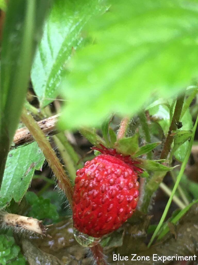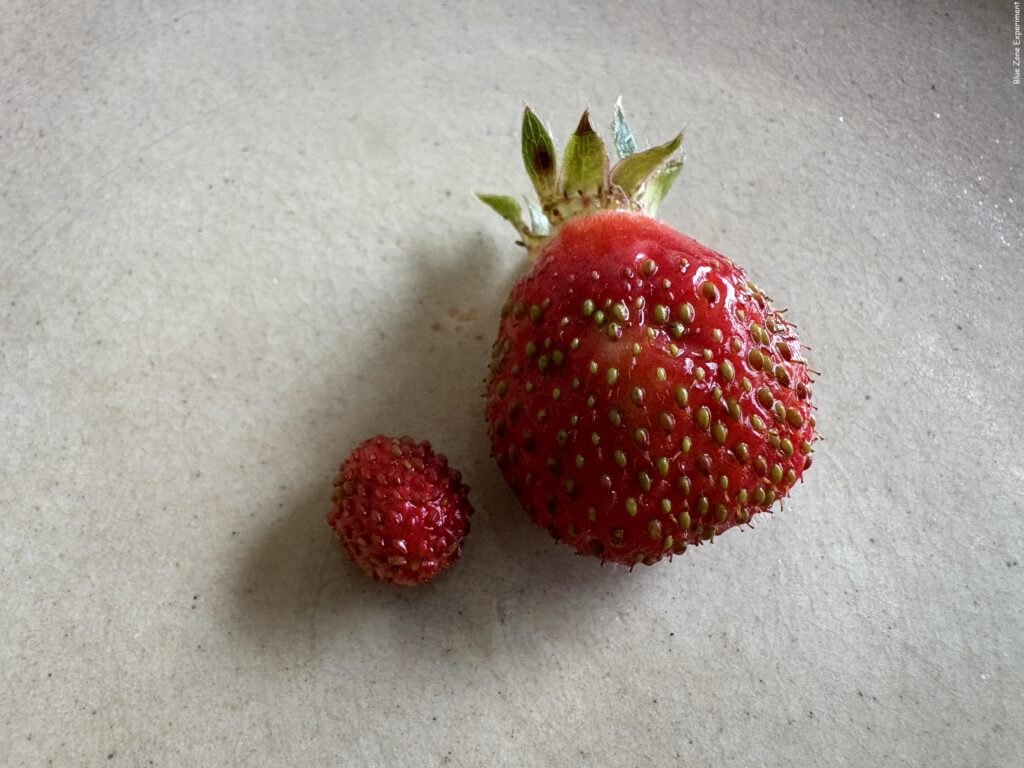 イチゴが一つだけ赤くなっていたので収穫しました。とても小さいですが、甘くておいしかったです。ワイルドストロベリーも一つだけですが真っ赤に色づいていました。