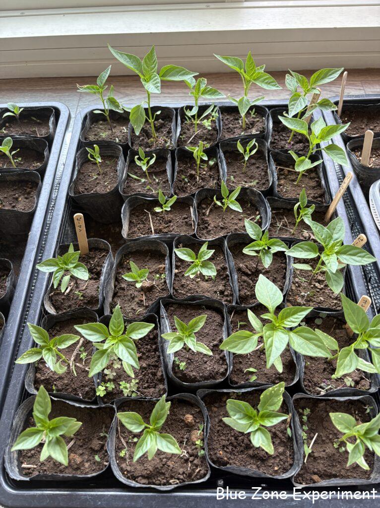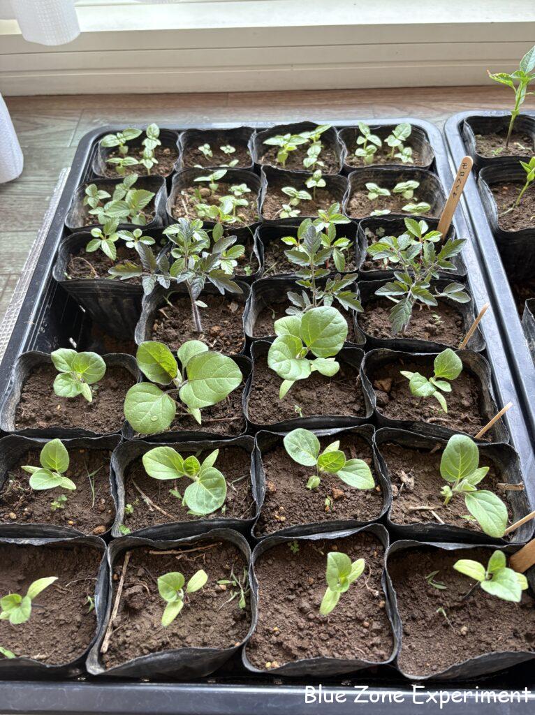 今日、ひと箱分近く畑に出したので、数が減りました。全体的に成長が遅れているので、ナス科の苗がすべて仕上がるのは、今月末くらいになりそうです。4 月 30 日に種をまいて発芽せず、その後まき足したホーリーバジルがようやく発芽しました。5 月 9 日に種をまいたカーボロ・ネロも発芽しました。サツマイモは、やっと調子を出してきました。定植時期に間に合うよう、ここからスピードアップしてもらいたいものです。