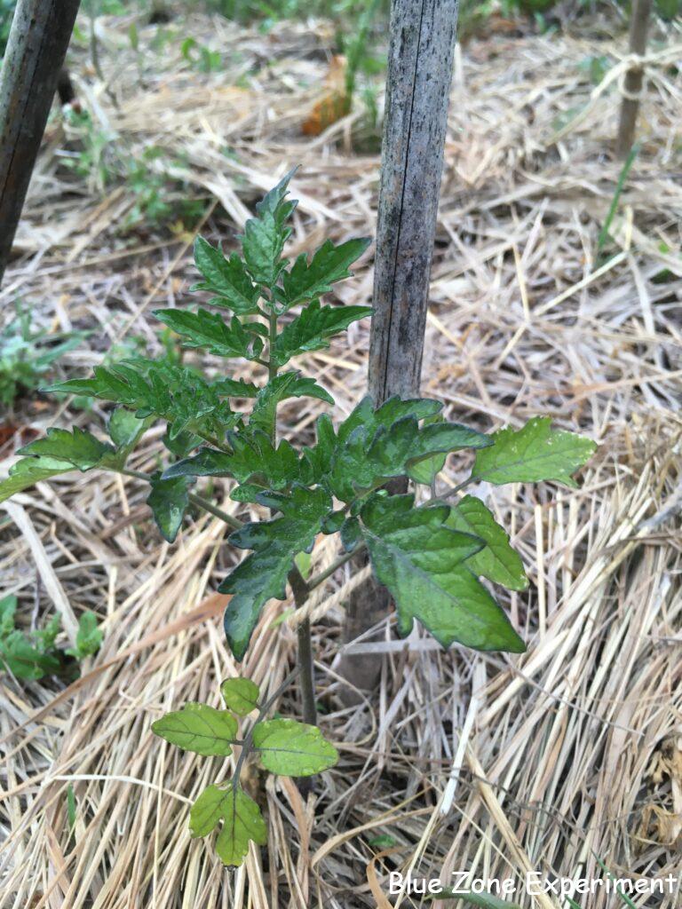 4 月 30 日に定植したズッキーニは、低温障害から回復していないのか、あまり調子がよくありません。あんどんに入っていて、日当たりが悪いのもよくないかもしれませんが、毎年ウリハムシの被害が深刻なので仕方ありません。5 月 5 日に定植したトマトも寒さでかなり色が悪くなっていましたが、少しは回復してきたようです。葉色はもう一つながら、体はしっかりしてきたように見えます。
