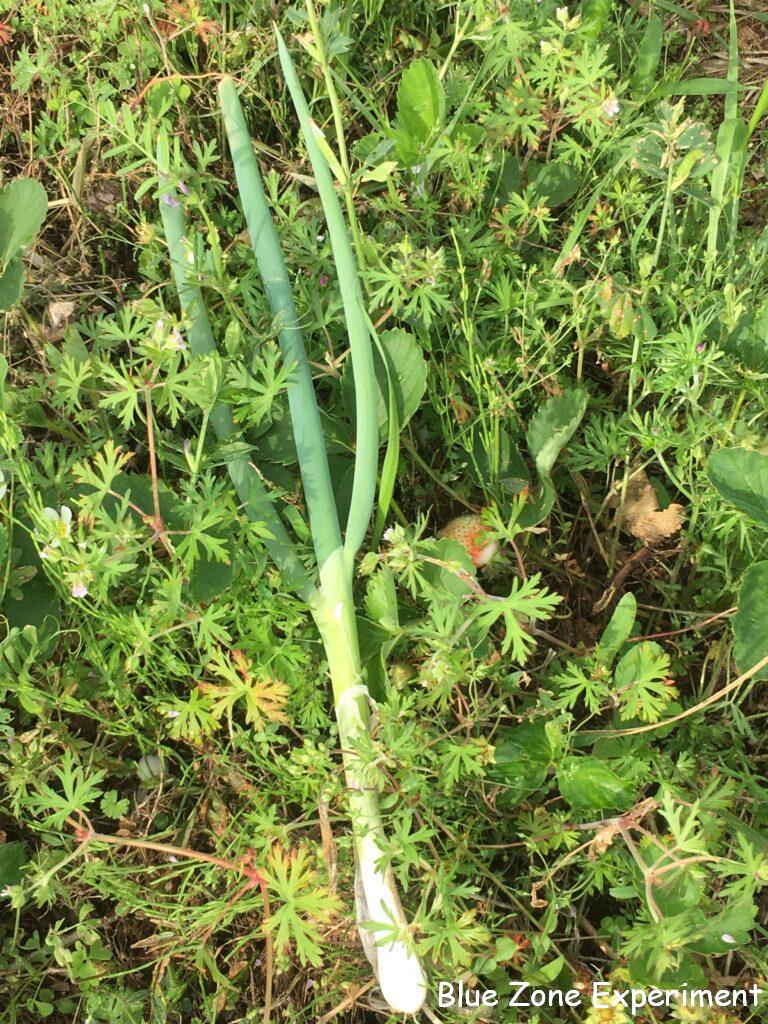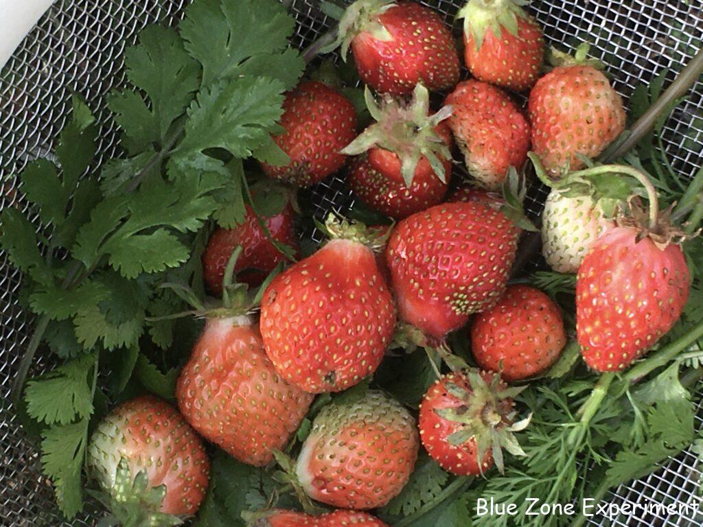 イチゴの畝に行ってみると、赤い実がなっているのが、ところどころに見えます。草だらけで、株も小さく、実も小さいのですが、少しでも収穫できてありがたいです。いつもは鳥よけの糸を張っていますが、今年はそれもしていません。それでも動物の被害が少なめなのは、草に埋もれて見つけにくいのかもしれません。それとも、お地蔵さんが守ってくれているからでしょうか? 九条ネギとパクチーも収穫しました。九条ネギの写真はイチゴの畝で撮ったので、イチゴが草に埋もれているようすがよくわかります。
