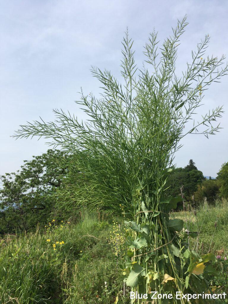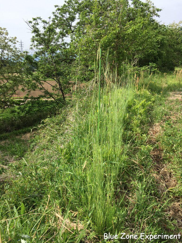 去年の秋に種をまいた自家採種のライムギは、細々として弱々しいですが出穂しています。去年の 3 月に貸農園から苗を移植したタチアオイは、どんどん大きく育っています。ニラは、自然に生えてきました。毎年勝手に生えてくるものはありがたいです。種を付けたカラシナは、背が高すぎて倒れてきていたので、紐で縛りました。