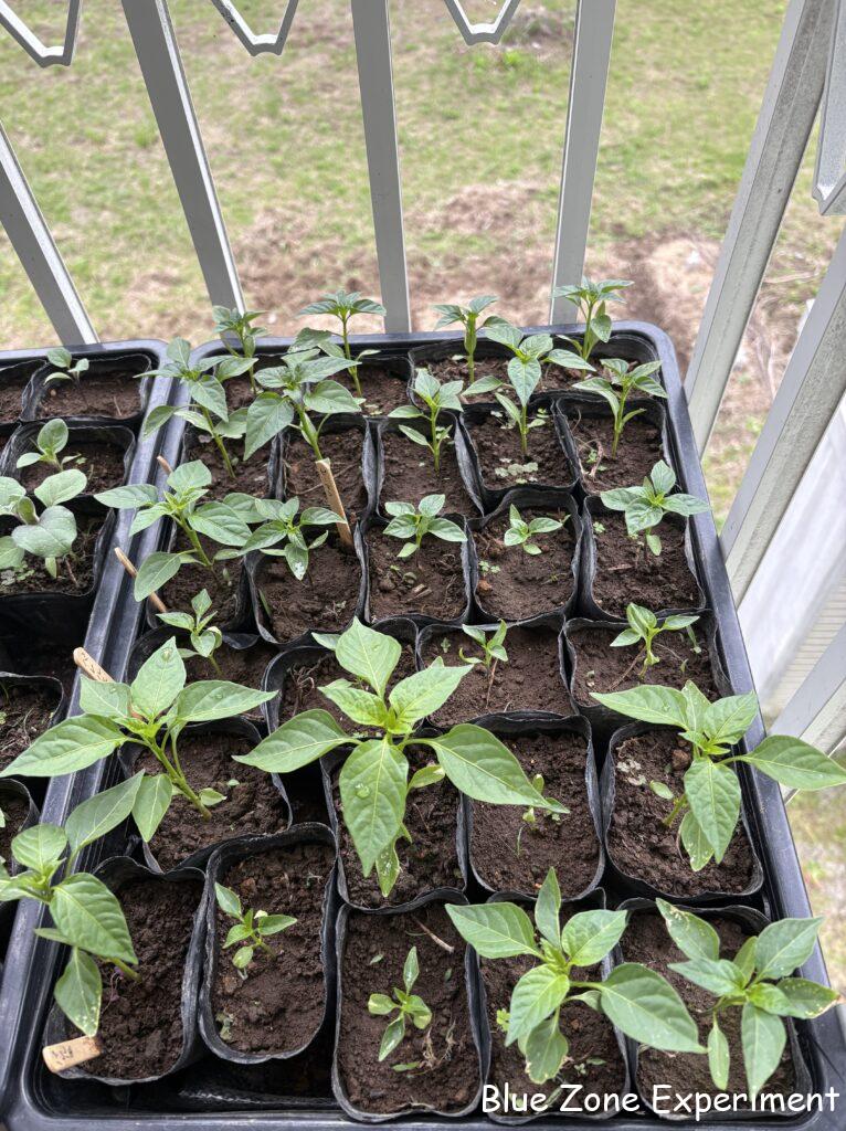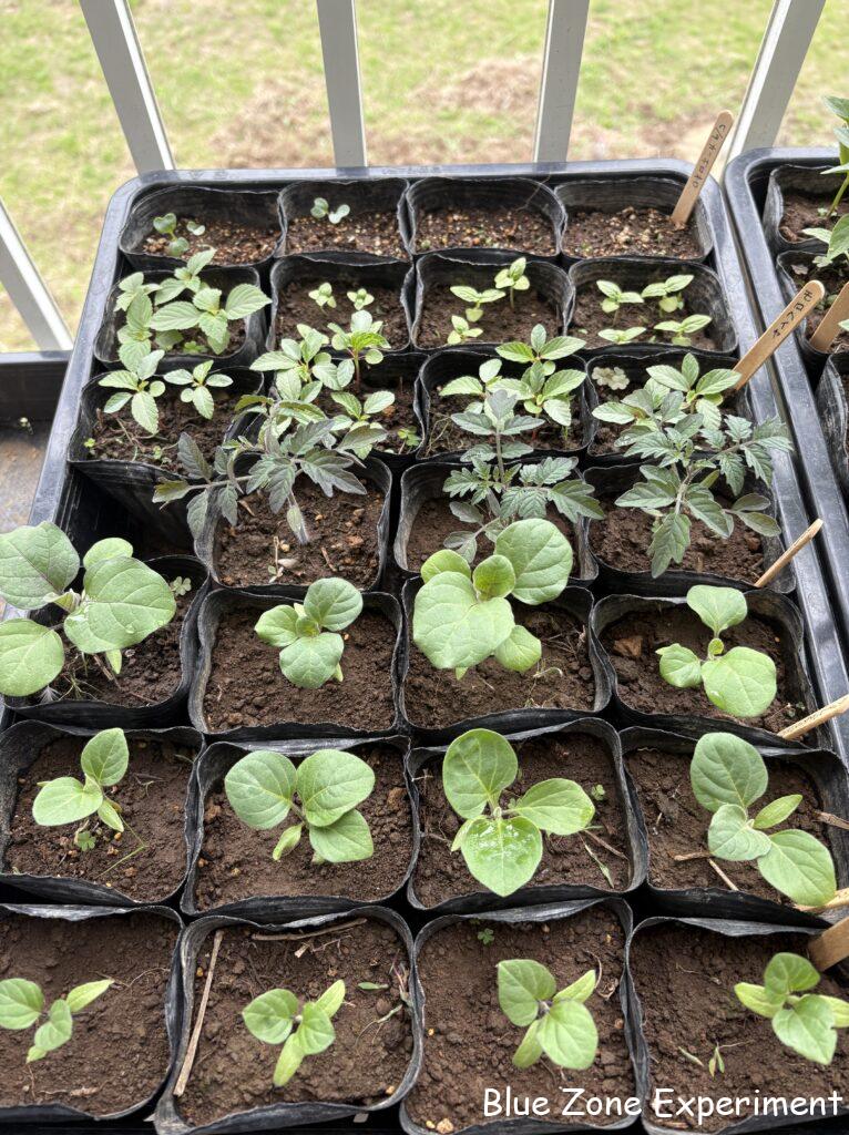 ナスやピーマンは、一部ハダニが付きはじめました。頻繁にチェックして、ハダニがいれば水で洗い流しているので、今のところ被害は限定的です。5 月 9 日播種のカーボロ・ネロ(ケール)は、すべてのポットで発芽しました。同日播種の熊本ナスは、今朝初めて発芽を確認しました。
