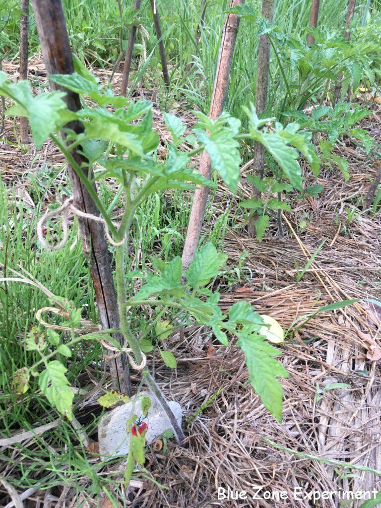 5 月になって順次定植しているトマトは、だんだんしっかりしてきました。今日初めて花が咲いているのも確認しました。テントウムシダマシの被害は、今のところあまりないようです。