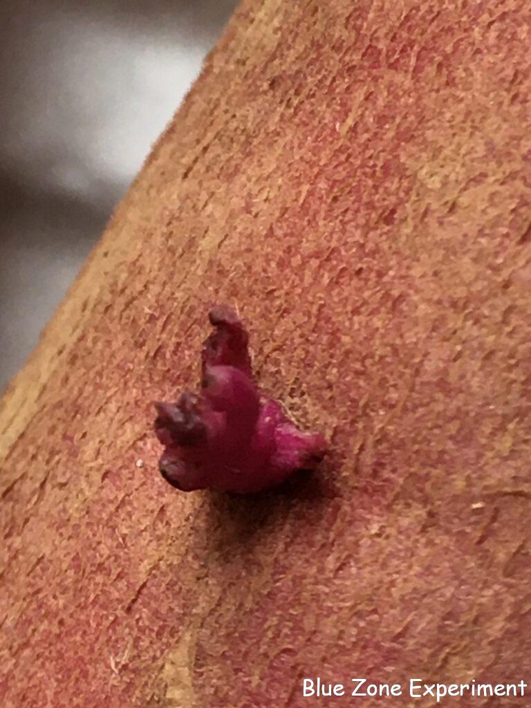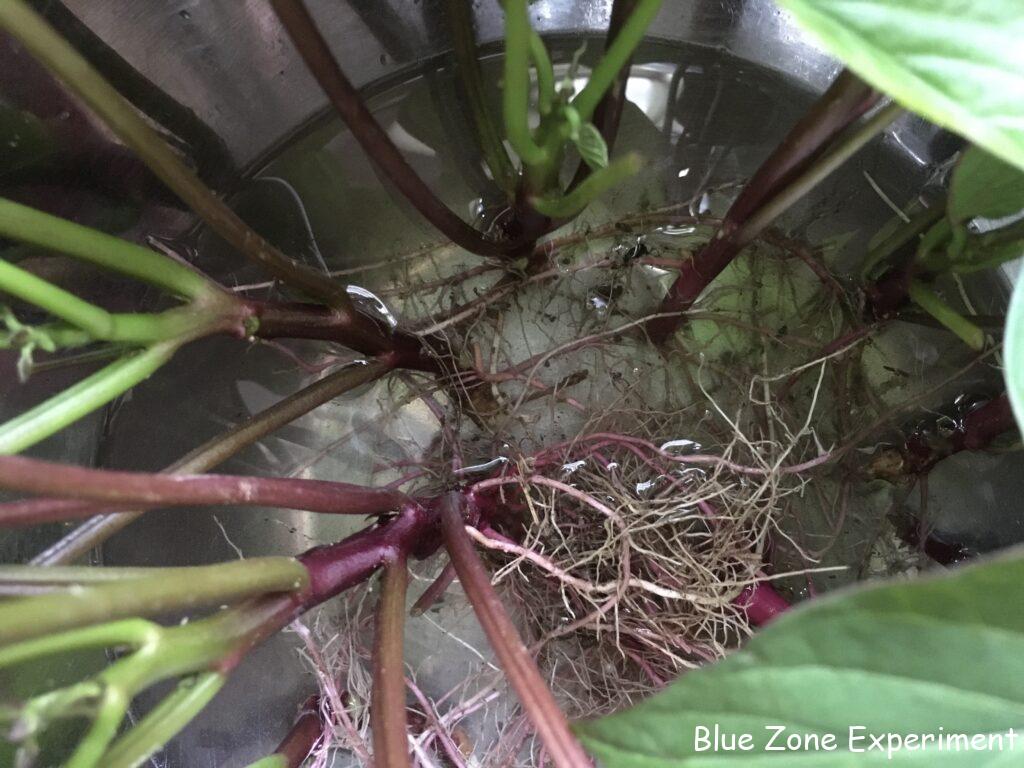 サツマイモの定植は、今月 12 日に続く二回目となります。11 日経って、10 本の苗が採れました。前回と合わせて 25 本です。今回は、すでに根が出ているものも多く、葉っぱも大きく成長しています。ただし、苗の長さは前回同様とても短いです。今回も前日から根元を水につけておきました。