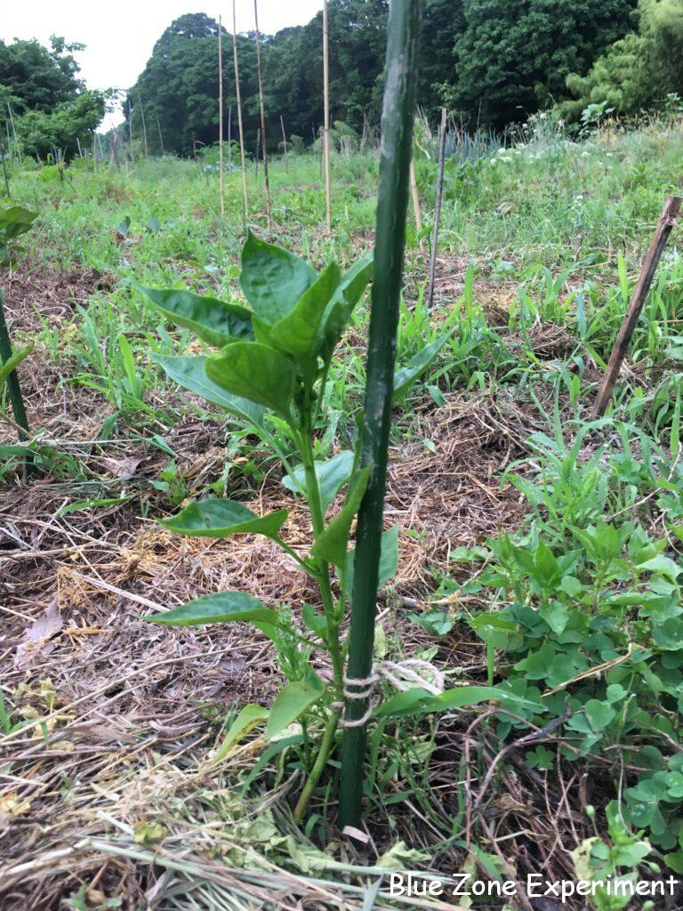 果菜類は、初夏に涼しかったせいか、いつもより成長が遅れ気味です。全体的に弱々しい感じで、草丈もあまり伸びません。かといって病気になっているわけでもないので、今後グングン成長するよう期待しています。