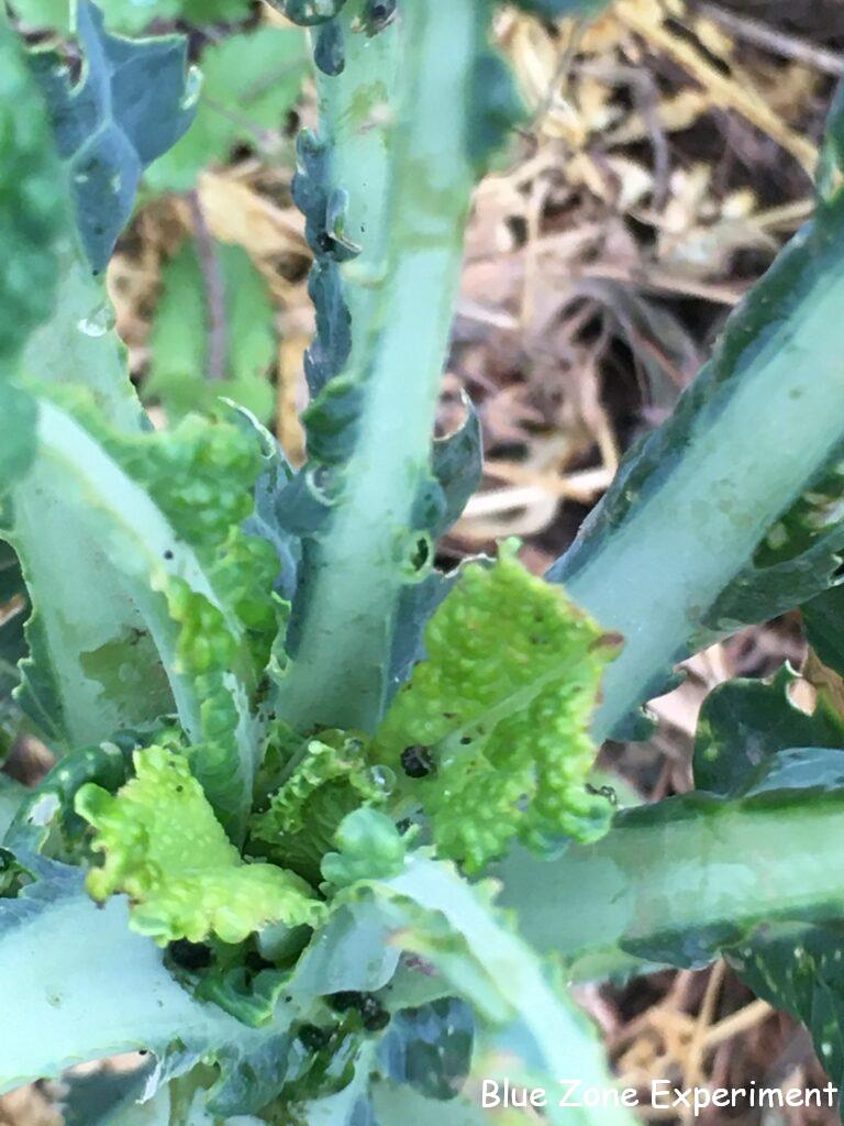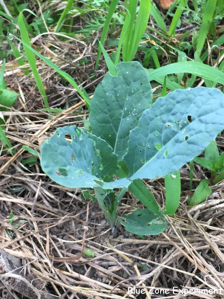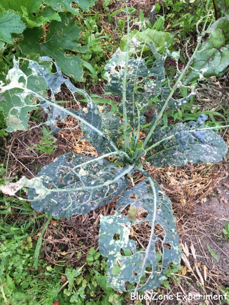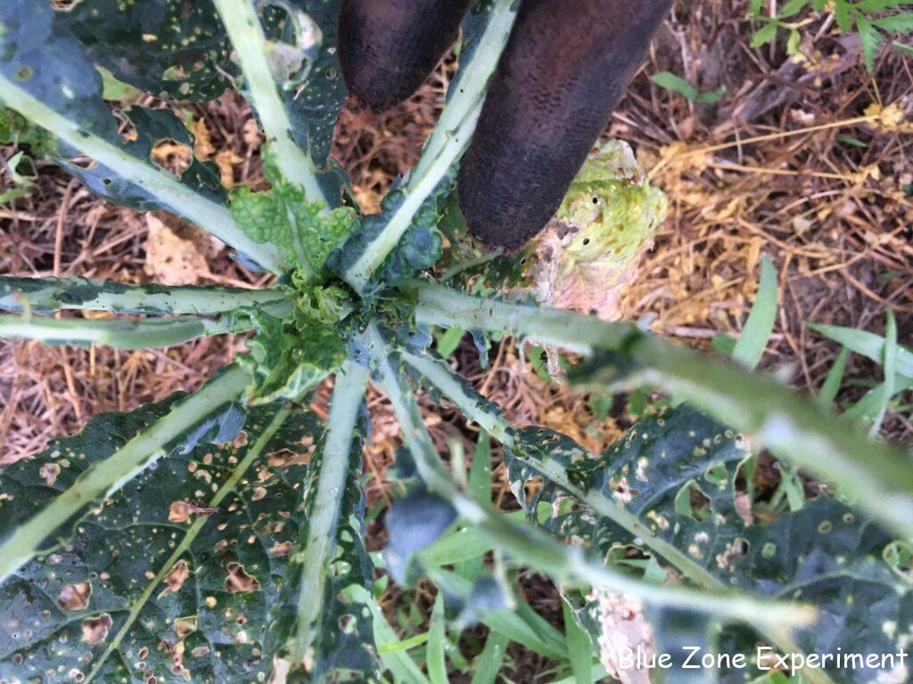 寒いうちに種をまき、強い霜とダイコンサルハムシを乗り越えて美しく育っていたカーボロ・ネロは、もう見る影もありません。二日前に見たときには、まだ芯の部分が生きているようでしたが、今日見てみるとさらに被害はひどくなり、生き残れるかどうか怪しくなってきました。もう青虫が食べる葉っぱはないのですが、ナガメがたかっていました。6 月 12 日に定植したカーボロ・ネロは、一株はなぜかぐったりと倒れていました。もう一株は元気そうです。