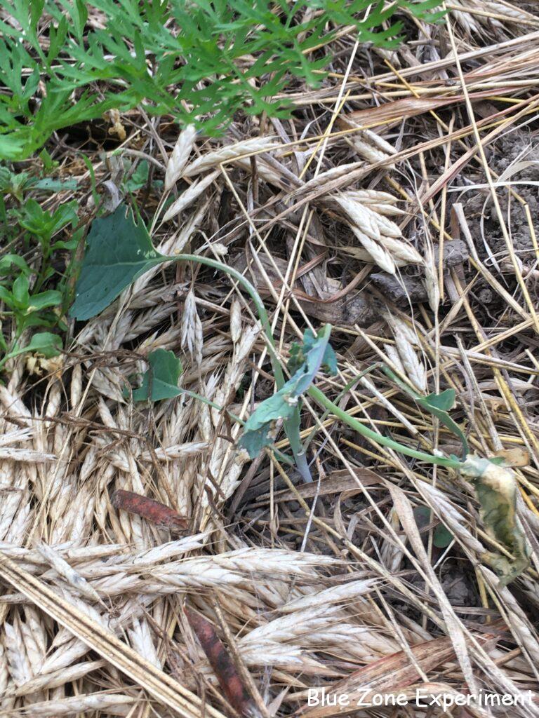 間違ってポケットに種を入れたまま洗濯してしまった大豆は、11 個中 4 個発芽しました。それをイチゴの畝に定植しました。