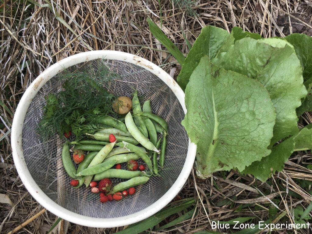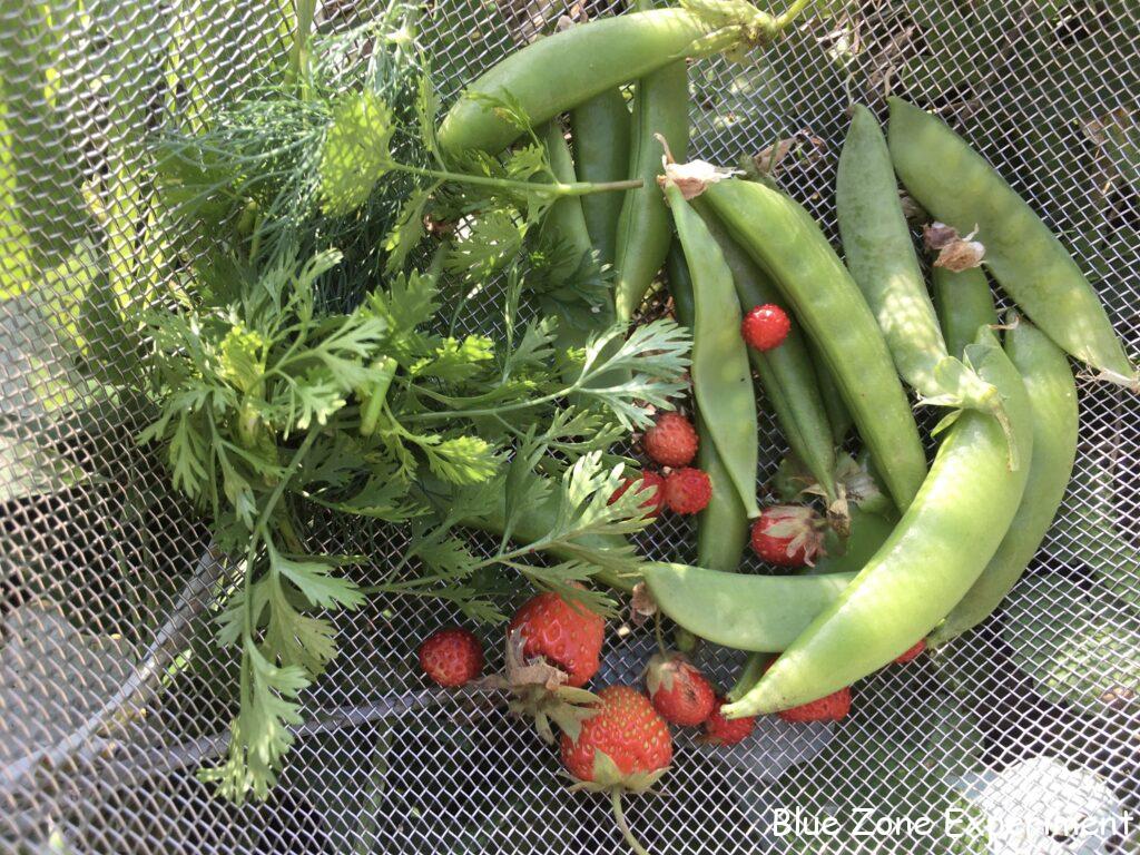 今日の収穫は、スナップエンドウ、キヌサヤ、イチゴ、ワイルドストロベリー、パクチー、ディル、ロメインレタス。ロメインレタスは、なかなか立派に成長しました。イチゴとワイルドストロベリーは、もう終わりです。スナップエンドウとキヌサヤももう終わりかけで、うどん粉病にもかかり、莢も曲がっていたり、小さかったり。そのまま太らせるとグリーンピースになるということで、今日は太ったものも少し収穫してみました。莢から出すと、まさにグリーンピース! 得した気分です。