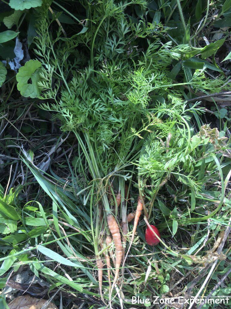おとといの収穫も内容はほぼ同じ。ニンジンを間引いたので、間引き菜を持ち帰って料理に使いました。