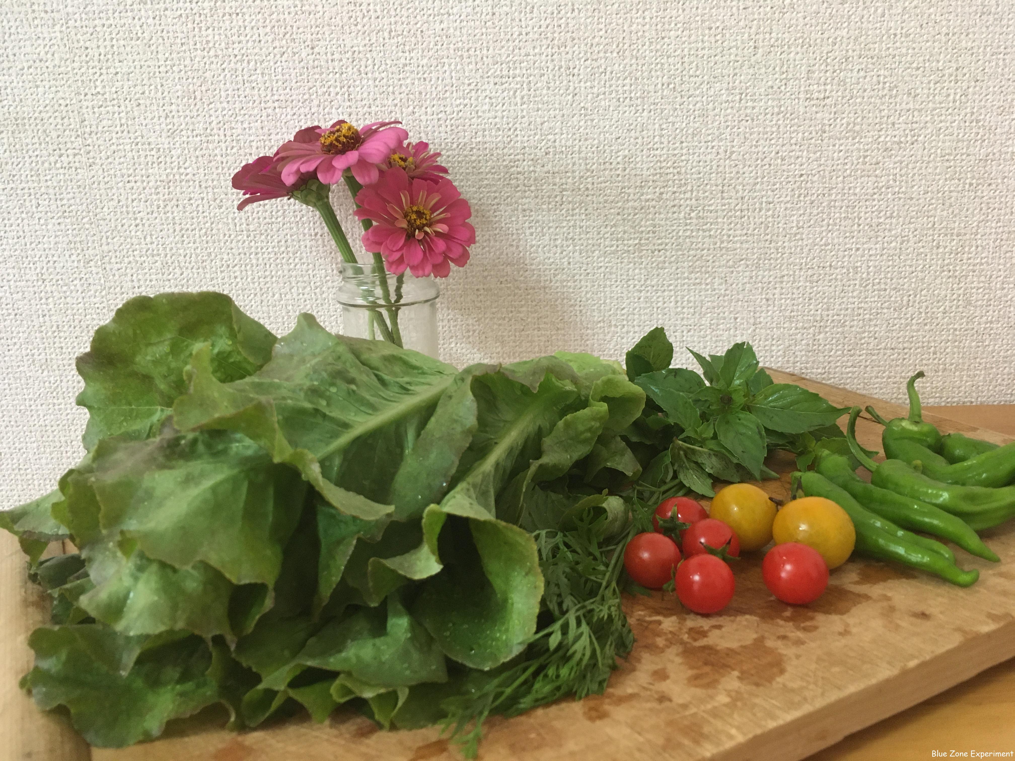 とう立ちしだしたサニーレタス、間引きニンジン、伏見甘長トウガラシ、ミニトマト、ホーリーバジルを収穫しました。ほんの少しですが、やっと夏野菜が収穫できてうれしいです。