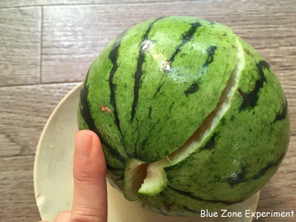 9 月 2 日。9 月に入っても真夏の暑さが止まらず、カラカラに乾燥した畑ですが、たくさん収穫できました。ナスは、パープルミニという品種が好調でたくさんなっています。遅まきのキュウリもやっと実がつきはじめました。こぼれ種のトマトは好調です。スイカは、まだ早いかもしれないとは思いながら、動物の爪痕もあったので収穫することにしました。蔓から外したとたんに割れてしまったので、早く収穫してよかったのかもしれません。これも残念ながら、ちょっと薄味でした。今もとても小さい実が一つだけ残っていますが、この辺りは急激に寒くなるので、大きくなれるかはわかりません。シソは葉っぱが小さめではありますが、たくさん収穫できています。