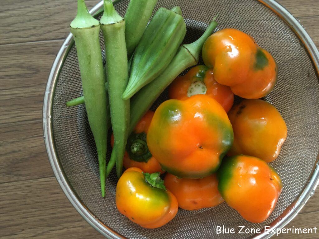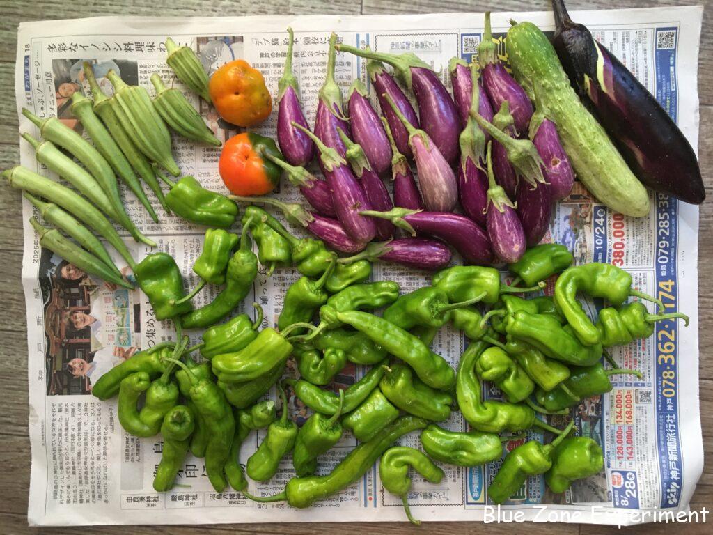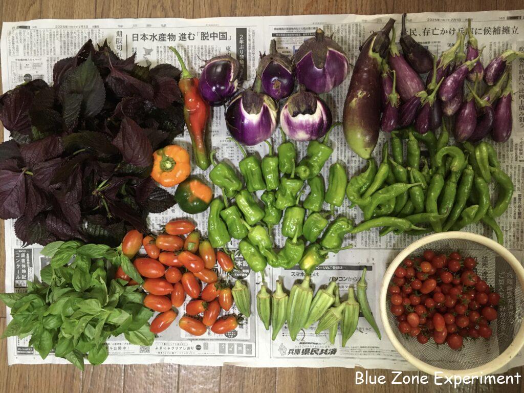 9 月 23 日。いつもはこの時期はタバコガの被害がひどいミニトマトですが、今年の被害は少ないです。キュウリは、遅い時期に種をまいたものが育っていますが、知らないうちに巨大化して、食べられなくなっているものがいくつかあったものの、収穫できるものは一つだけでした。ナスは 3種類。トウガラシ類はたくさん実をつけています。落花生は、茹でて食べてみましたが、ほくほくしておいしかったです。