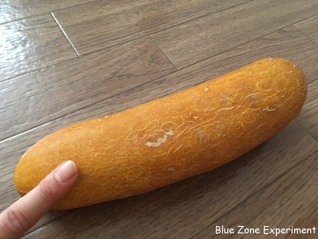 9 月 3 日。前日は収穫目的で畑に来てたくさん収穫しましたが、この日は定植と種まきが目的です。忙しかったので、目についたものだけを収穫しました。小さめのカボチャは 820 グラムでした。キュウリは実がつき始めたところなので、株に負担をかけないように、小さいうちに収穫します。