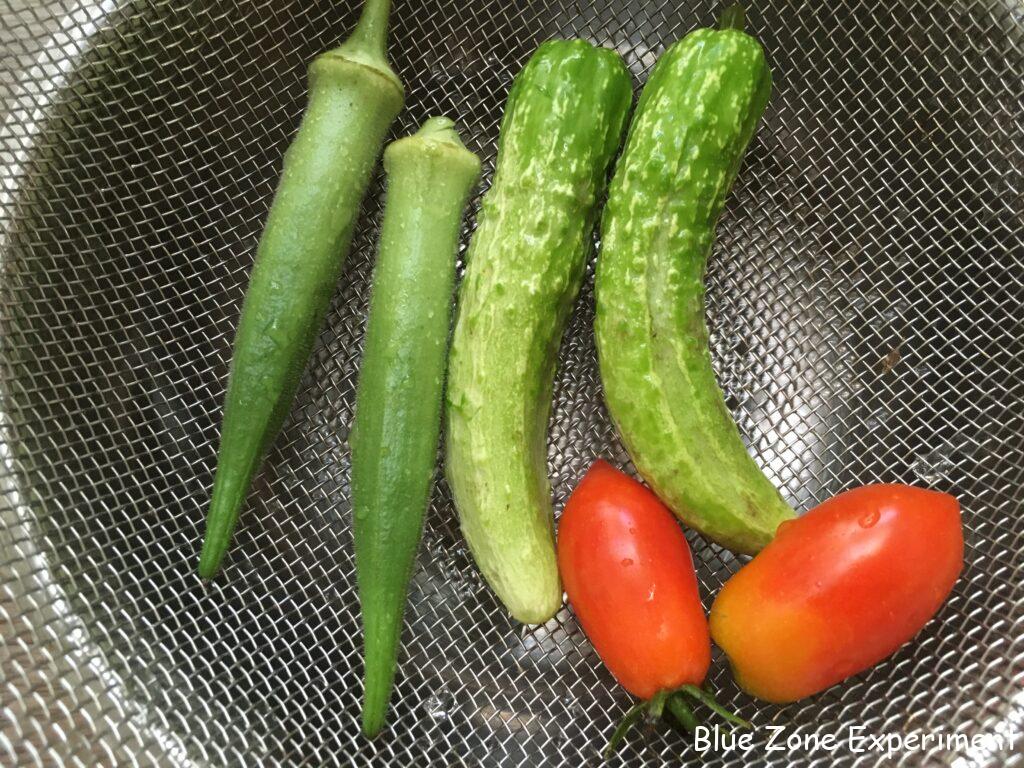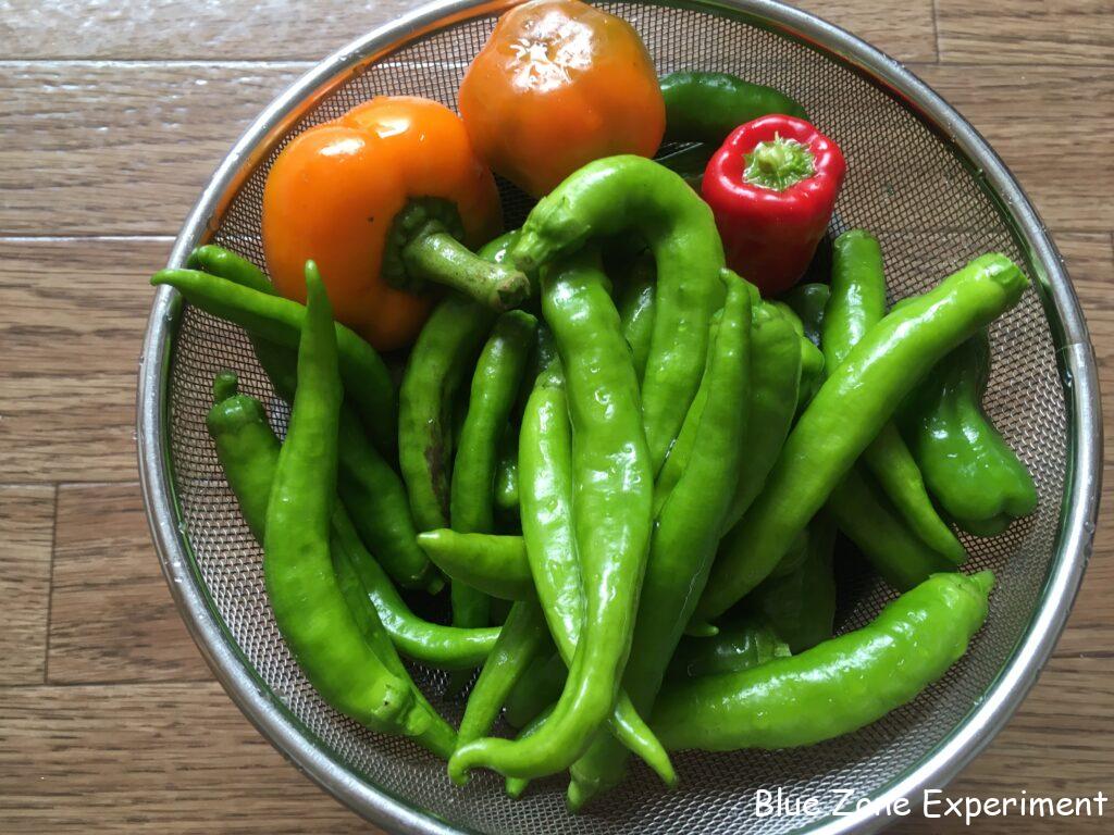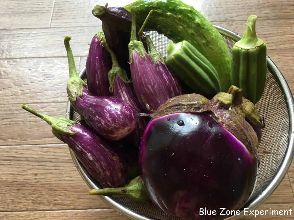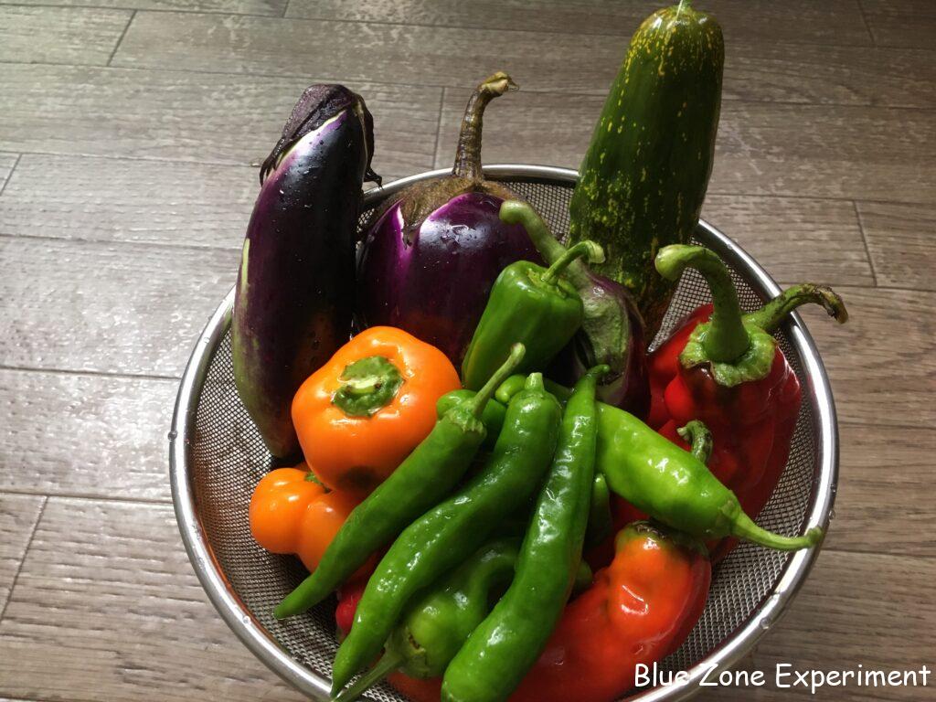 9 月 23 日。いつもはこの時期はタバコガの被害がひどいミニトマトですが、今年の被害は少ないです。キュウリは、遅い時期に種をまいたものが育っていますが、知らないうちに巨大化して、食べられなくなっているものがいくつかあったものの、収穫できるものは一つだけでした。ナスは 3種類。トウガラシ類はたくさん実をつけています。落花生は、茹でて食べてみましたが、ほくほくしておいしかったです。