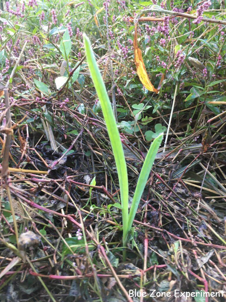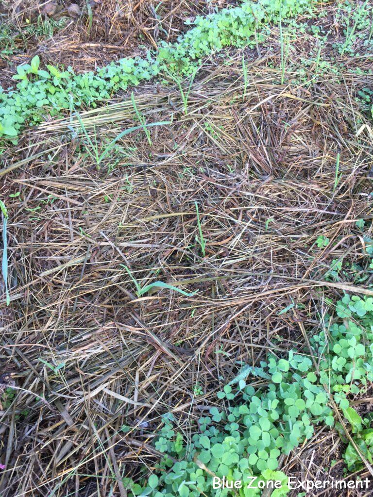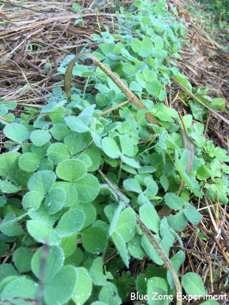 9 月 14 日に植え付けたニンニクの発芽がそろいました。コンパニオンプランツとしてのクリムゾンクローバーの種を東西にまきましたが、それもきれいに発芽しています。