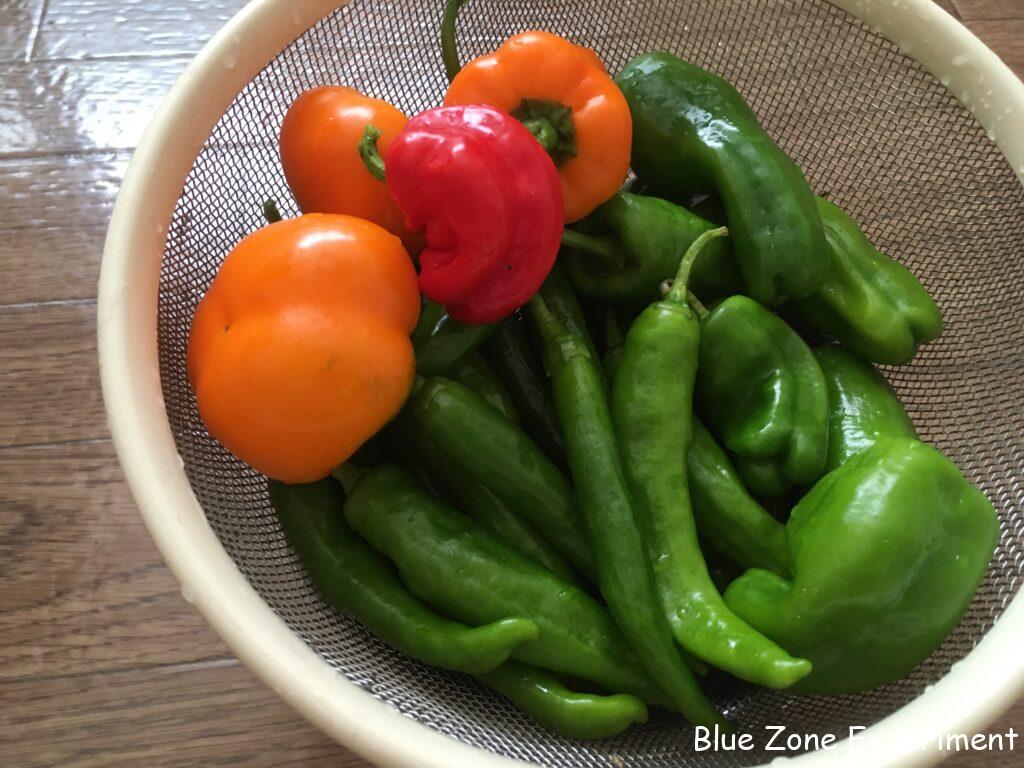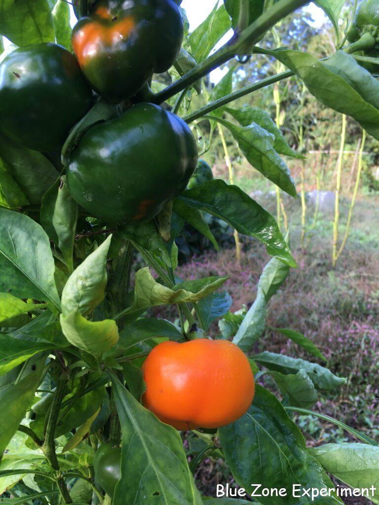 ナスはもうほとんど実がついていませんが、トウガラシ類はまだまだ実っています。オレンジミニパプリカは、たくさんなっているのですが、霜が降りるまでにオレンジ色に変わるかはあやしいところです。暑さで花が落ちて収穫できなかったインゲンですが、今もよく茂っています。その上に、こぼれ種から発芽したトマトも絡みつき、ものすごいことになっています。ジャングルです。