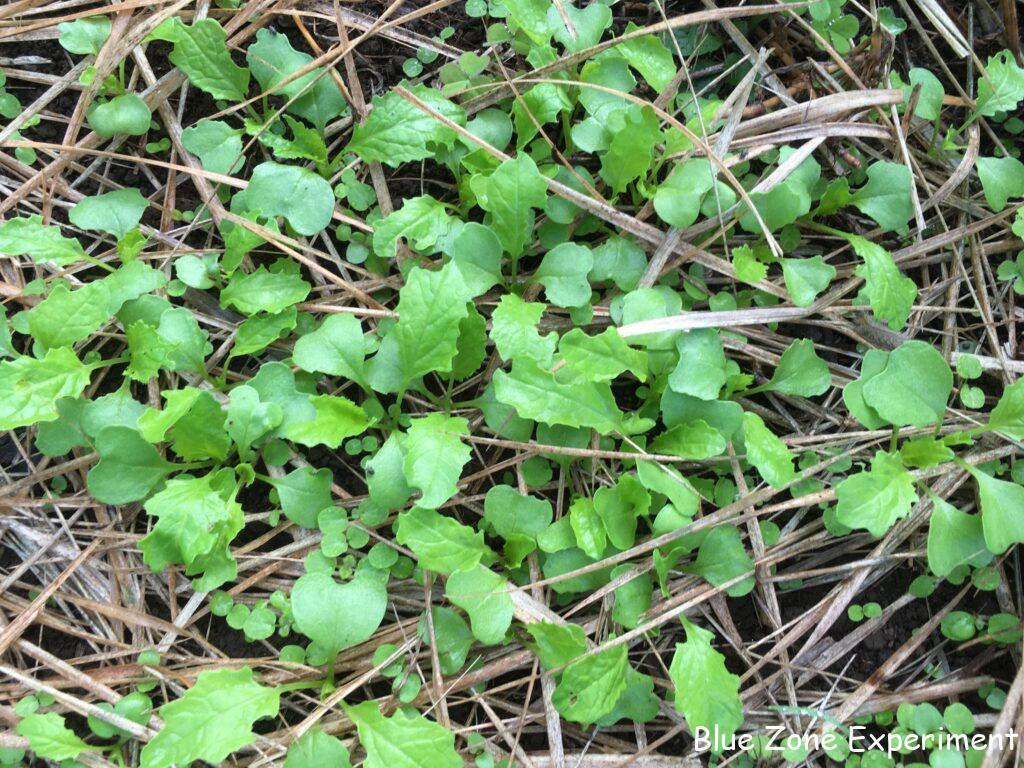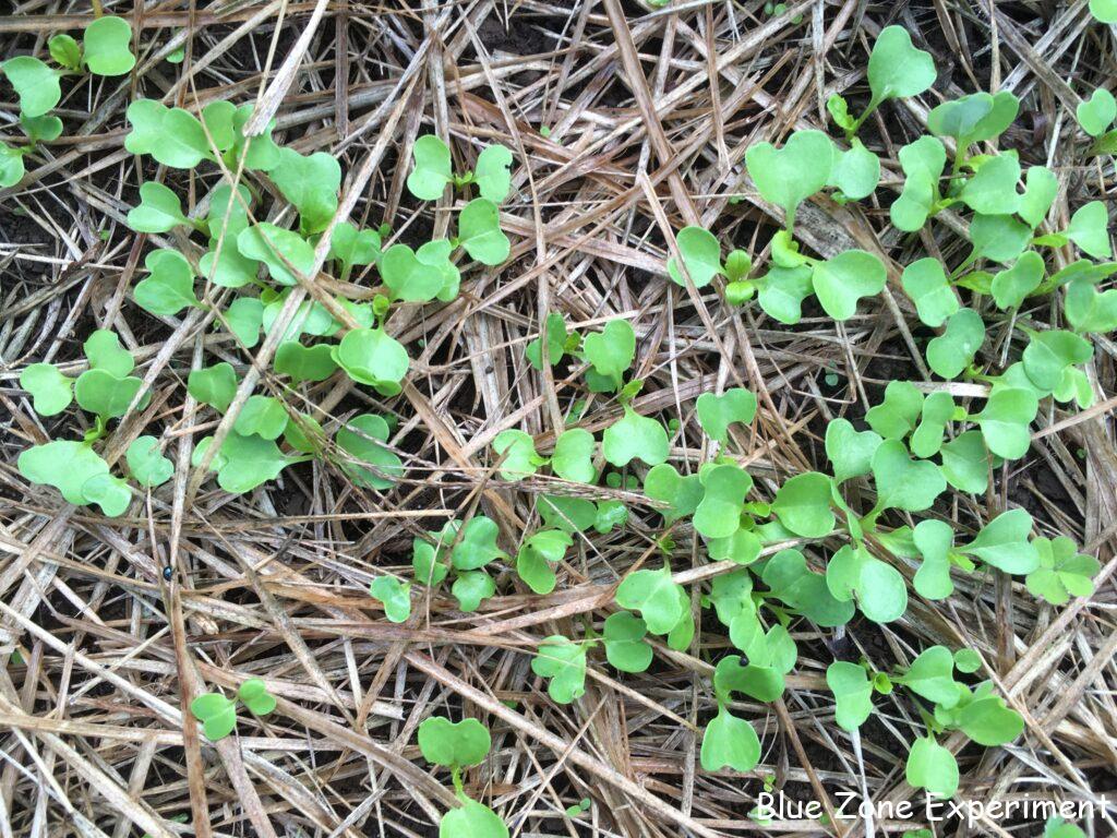 9 月 14 日に植え付けたニンニクの発芽がそろいました。コンパニオンプランツとしてのクリムゾンクローバーの種を東西にまきましたが、それもきれいに発芽しています。