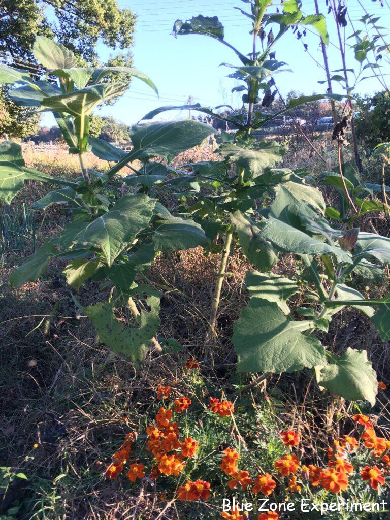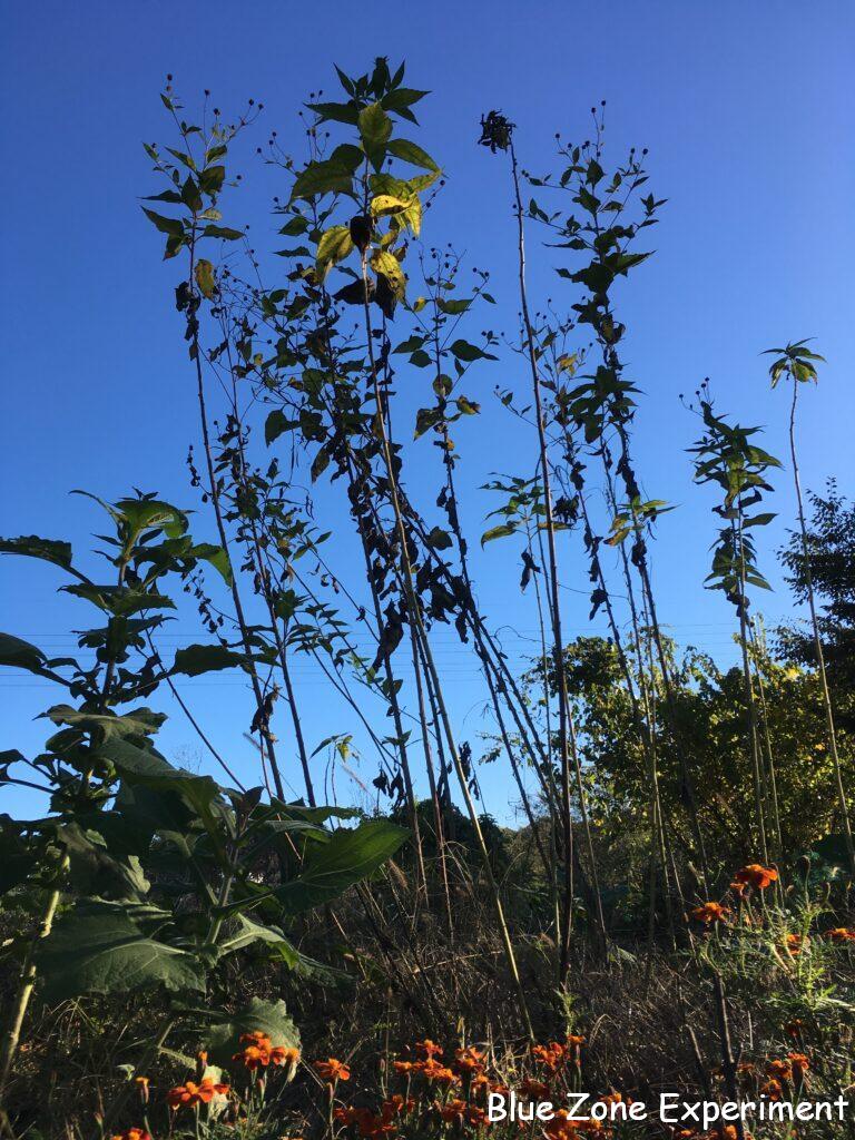 キクイモは草丈 3 メートルはありそうです。ヤーコンは、地力の低い畝なので、あまり大きくは育っていません。サツマイモがイノシシで全滅したので、キクイモとヤーコンに期待しています。