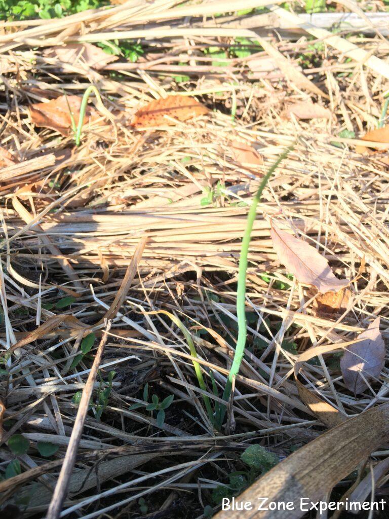 自家製タマネギ苗は、小さいうちに霜に当たり弱々しい姿です。虫に食われて消えてしまったものもあります。それに反して、先ほどのキャベツと同じ防虫ネット苗に、もっと後に植えたタマネギ苗(いただいた苗)は、ずっと勢いがあります。