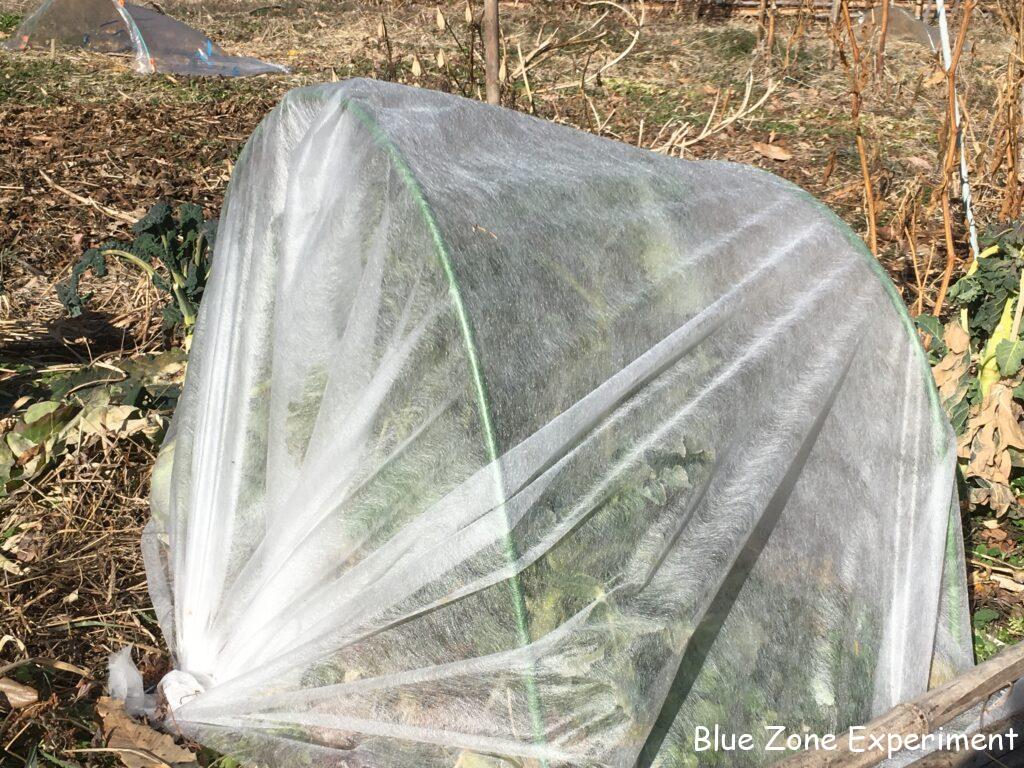 巻いた白菜は今日収穫してしまいましたが、巻いていないものは、春に菜の花として収穫します。白菜の菜の花はとてもおいしいですし、その時期にはほぼ収穫できるものがないので、とてもありがたい存在です。ブロッコリーは、霜には強くないので、かなりヨレヨレになってきていました。不織布をかけてみましたが、少しでも元気になってくれるでしょうか。