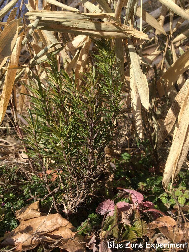 ほうれん草は、ほとんど発芽せず、発芽したものもいつの間にか消えてしまいましたが、一か所だけひっそりと生き残っているところがありました。小さいですが、寒さには強いので元気そうです。ローズマリーも寒さにはかなり強いですが、この寒さで、さすがに葉っぱが黄色っぽくなってきました。笹の風よけは、少しは役立っているでしょうか。