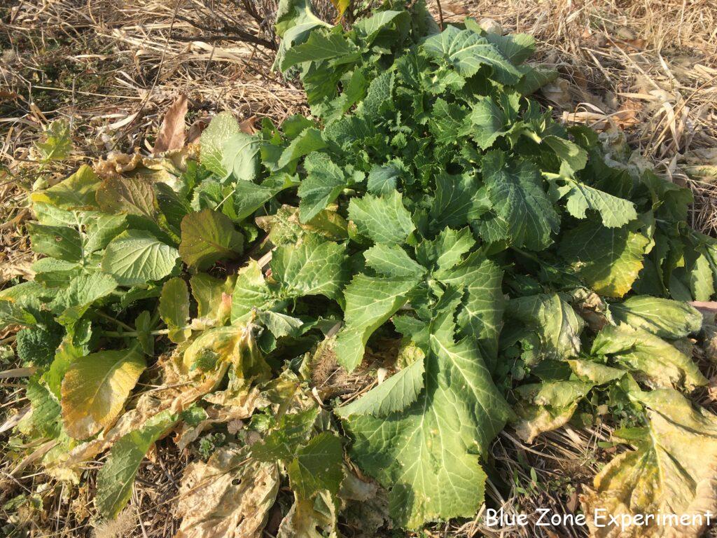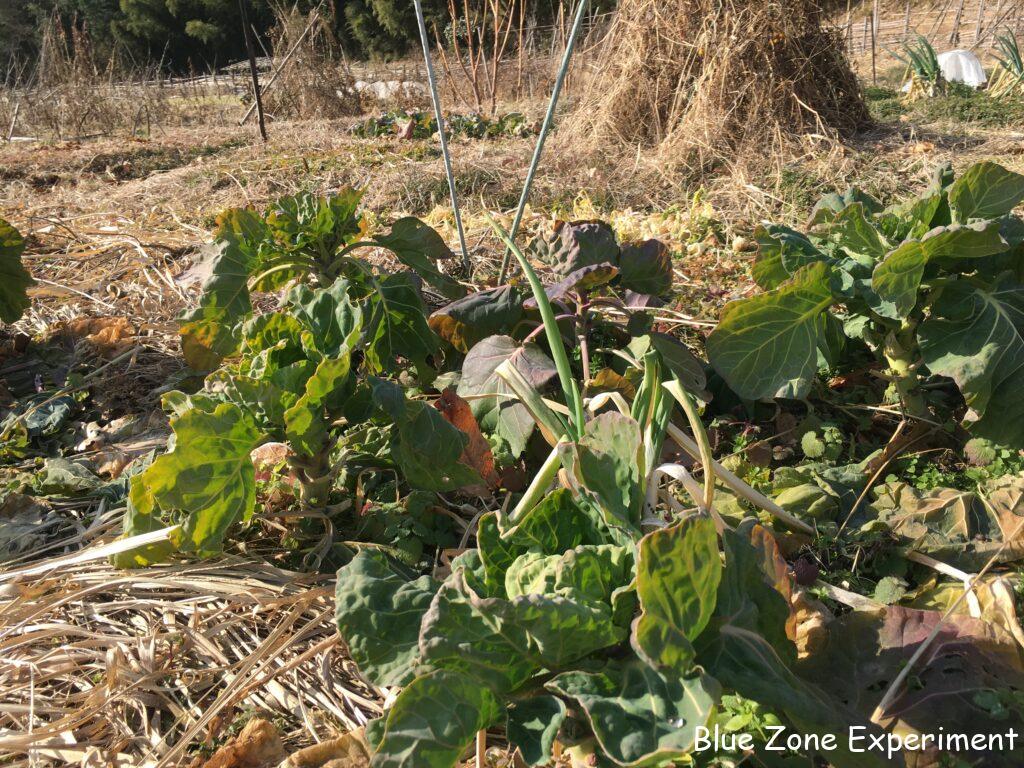 枯れ果てた畑にも、少しだけ緑が残っています。カーボロネロは、はじめての栽培ですが、寒さにはかなり強いようです。ほとんど成長はしていませんが、葉っぱはしっかりしています。カラシナもいつも通り元気です。芽キャベツも少しですが脇芽が成長してきました。ルッコラは、かなり霜にやられてきましたが、まだ収穫できます。富士早生キャベツは、冬に収穫の予定でしたが、寒さでほとんど成長していないので、収穫は春になりそうです。