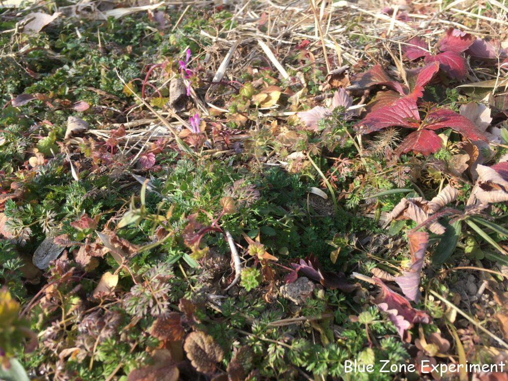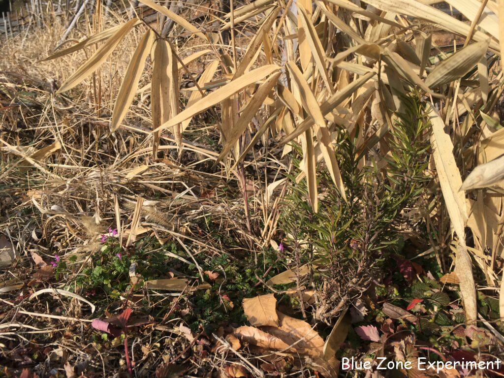 ワイルドストロベリーは赤い葉っぱでなんとか生き延びています。オルレアは地面に張り付いて大きく広がっているので、春にはたくさん花を咲かせてくれそうです。笹で風よけをしているローズマリーは、葉っぱが変色してつらそうですが、何とか頑張っているようです。足元には、ホトケノザが咲いています。