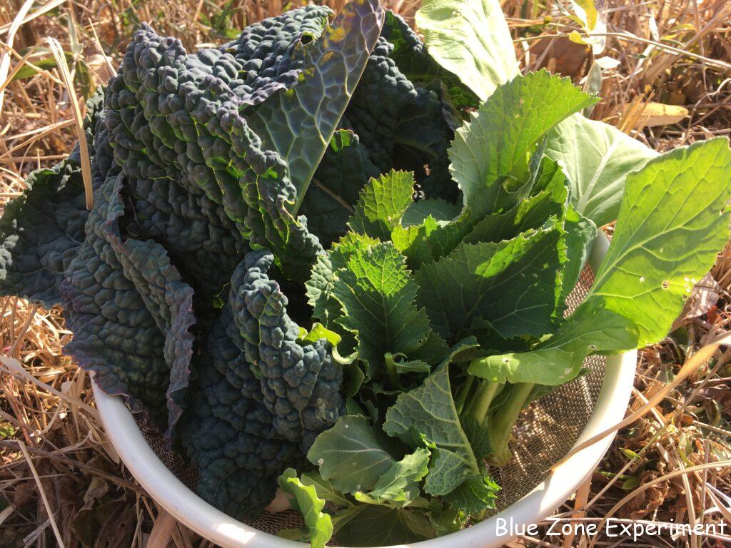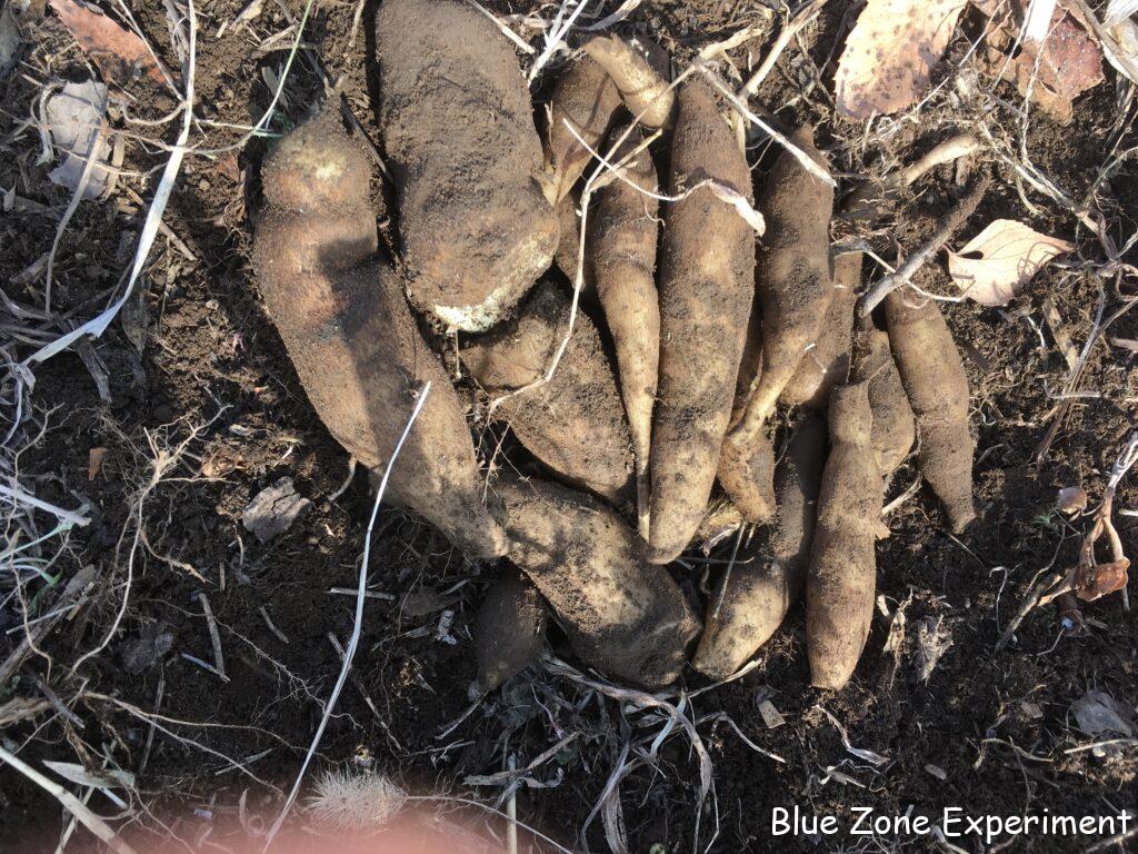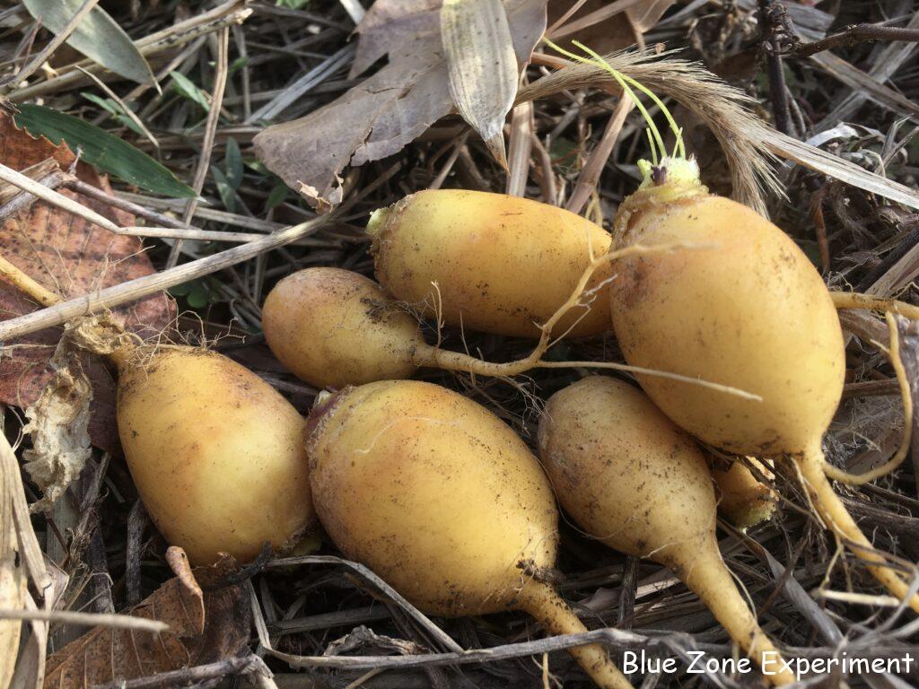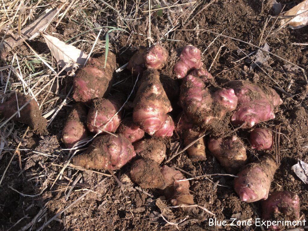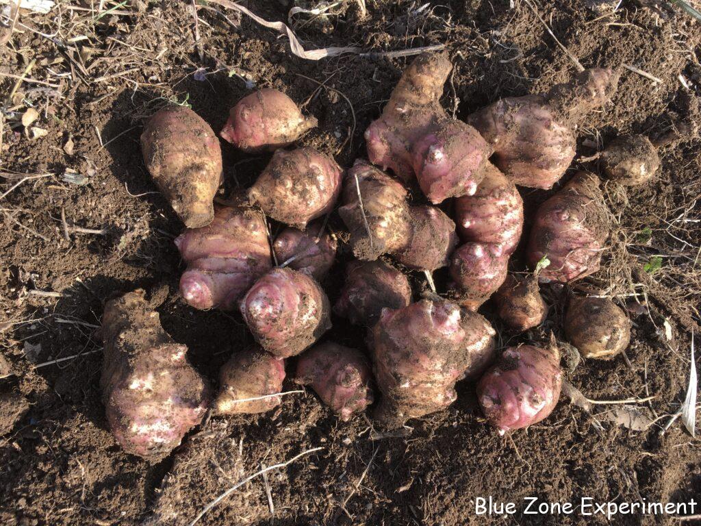 キクイモを収穫しました。3株ほど掘って、掘った場所には、また種芋を埋めておきました。赤いキクイモと普通の白いキクイモの両方を植えましたが、今まで収穫したものは赤ばかりです。そろそろ白も出てくるかと、さらに二株掘りましたが、また赤でした。調べてみると、赤のほうがイヌリンが豊富で、より健康によさそうです。ヤーコンの最後の一株も掘りましたが、小さい芋が多かったです。他には、不織布をかぶせてあった金カブを収穫しました。少しは成長するかと期待して置いてありましたが、小さいままでした。葉物は、カーボロネロが主体です。