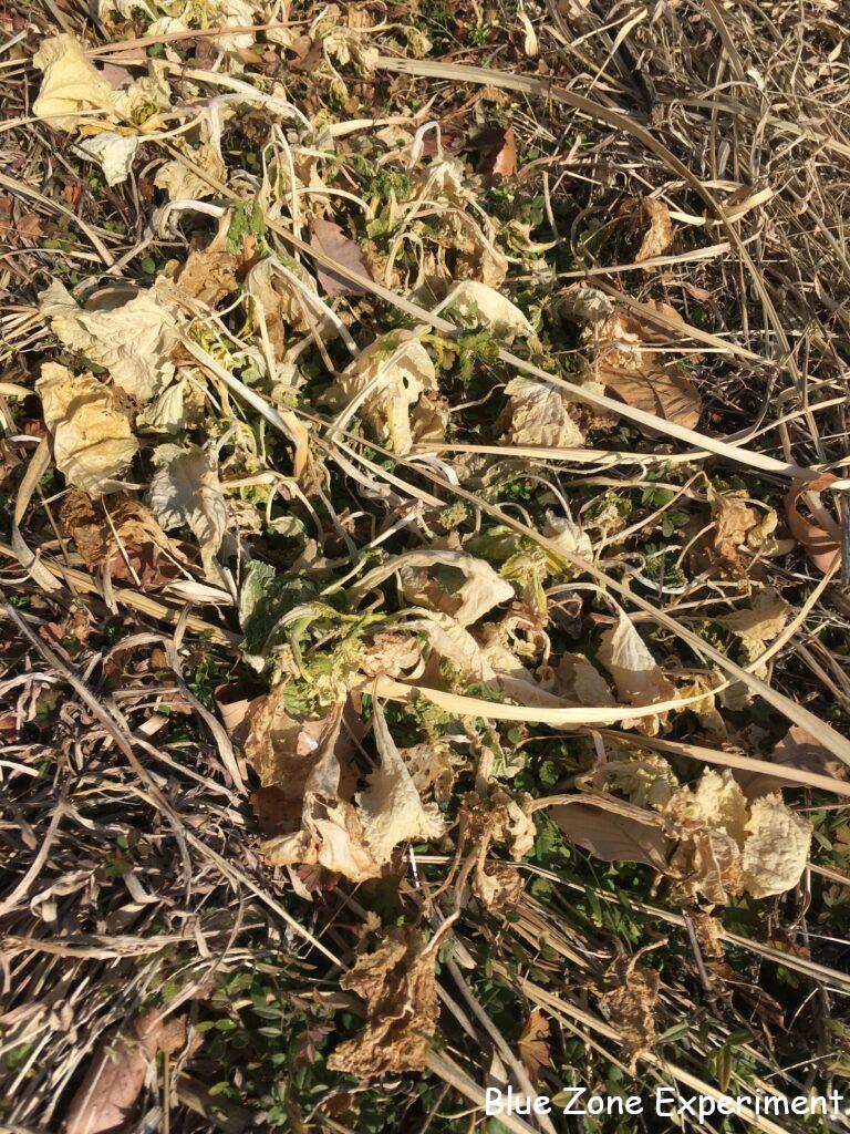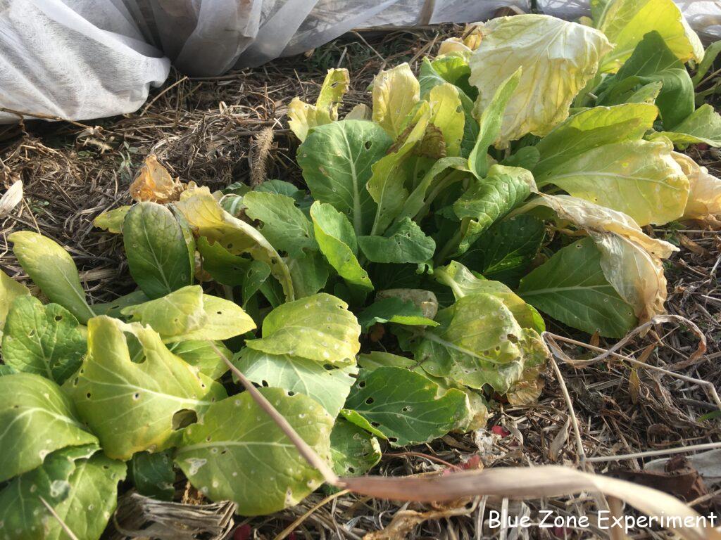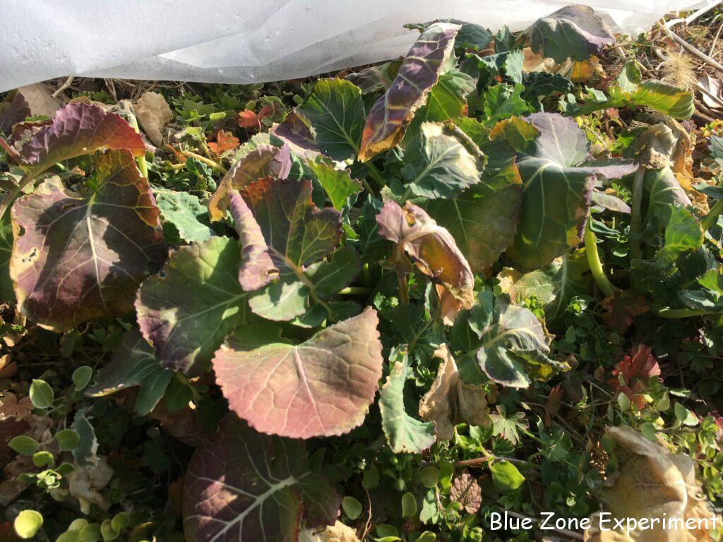 野ざらしの野菜はもちろんですが、不織布の下の野菜も、色が変わってすっかり弱っています。もう収穫できる状態ではありませんが、春まで生き残って菜の花として収穫できることを願います。