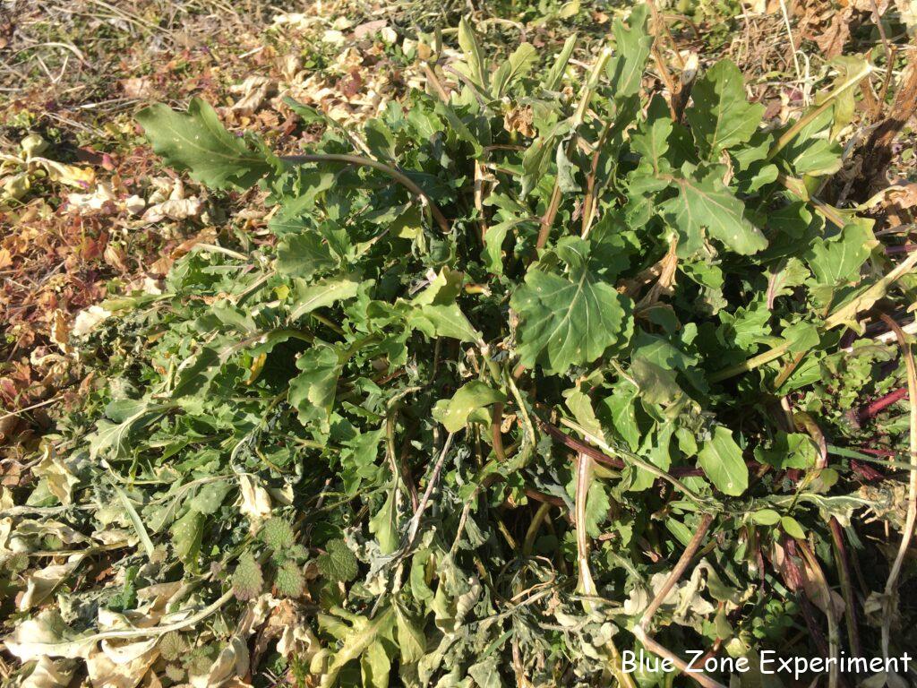 枯れ果てた畑にも、少しだけ緑が残っています。カーボロネロは、はじめての栽培ですが、寒さにはかなり強いようです。ほとんど成長はしていませんが、葉っぱはしっかりしています。カラシナもいつも通り元気です。芽キャベツも少しですが脇芽が成長してきました。ルッコラは、かなり霜にやられてきましたが、まだ収穫できます。富士早生キャベツは、冬に収穫の予定でしたが、寒さでほとんど成長していないので、収穫は春になりそうです。