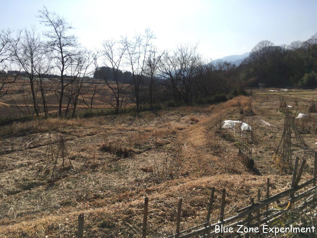 2026 年に入って初めての畑です。ここ数日は暖かかったですが、あさって頃には寒波がやってきて、その後は寒い日が続きそうなので、その前に少しでも収穫したいと思って、畑にやってきました。遠くから見ると、畑はすっかり茶色くなってしまいました。