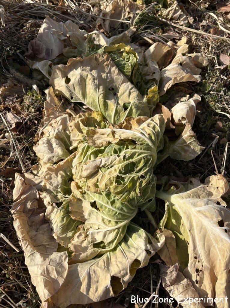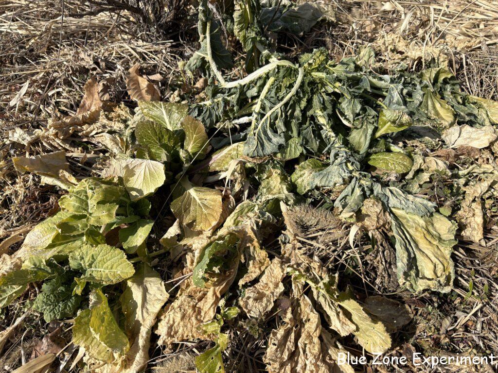 私の畑で最も寒さに強そうなカーボロネロは、葉っぱは緑ですが、虫に食われてボロボロです。他のものはほとんど枯れ果てているので、集中攻撃にあっているようです。この時期は寒くて成長が追い付かないので、食べられるとどうにもならない感じです。春には元気を取り戻してくれるといいですが、その頃にはとう立ちですね。寒さに強いカラシナも、さすがにこの寒さには耐えられず、ヨレヨレになっていました。キャベツも無残な姿です。