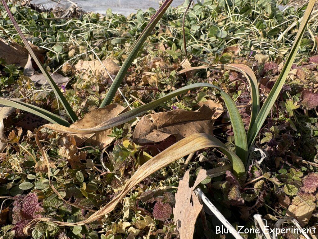 連日の寒さで、ニンニクの葉先はかなり枯れていますが、幸いすべて生きているようです。全滅したかのように見えたタマネギも、よく見ると、何とか生き残っています。暖かくなって、成長してくれますように!