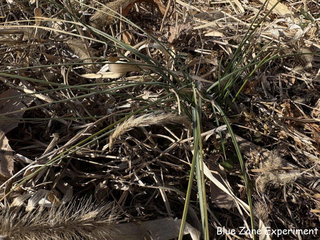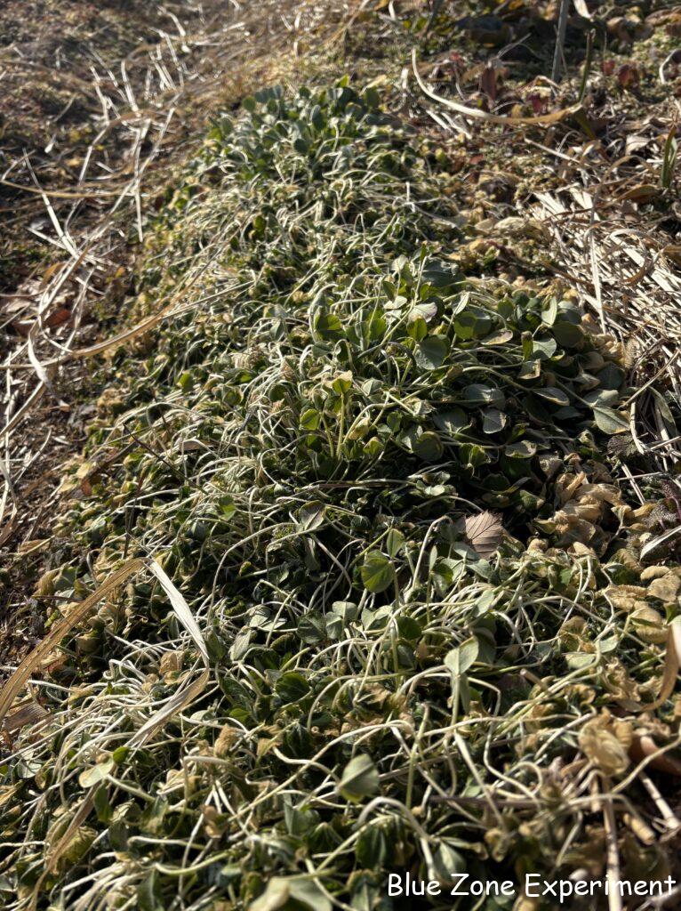 ハーブコーナーでは、サフランの葉が青々としていました。去年は冬には姿が見えなかったと記憶しているのですが、株が成長して、耐寒性が上がったのでしょうか。去年は、どこにあるかも定かでなかったので、そのまま植えっぱなしにしましたが、本来は、春に球根を掘り上げて干しておき、夏の終わりごろに植えるのが良いようです。同じくハーブコーナーのローズマリーも寒さに負けず、何とか緑を保っています。クリムゾンクローバーは、まだ緑ですが、霜ですっかり倒れています。今週末も強い寒波がやってきそうですが、そうはいってももうすぐ暖かくなるので、何とか生き延びてくれそうです。