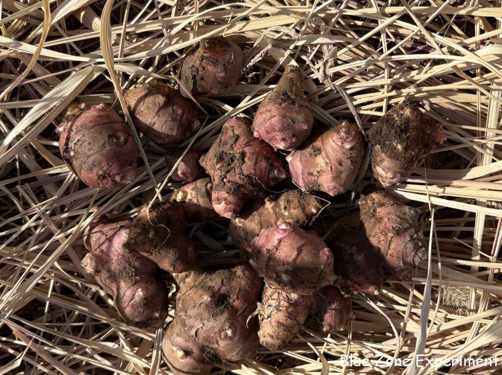 今日の収穫物はキクイモのみ。家に残っているのは、冷凍したり、乾燥させたりしたものを除くと、わずかな白菜と大根、ヤーコン、キクイモ、いただいたサトイモ少しだけとなりました。