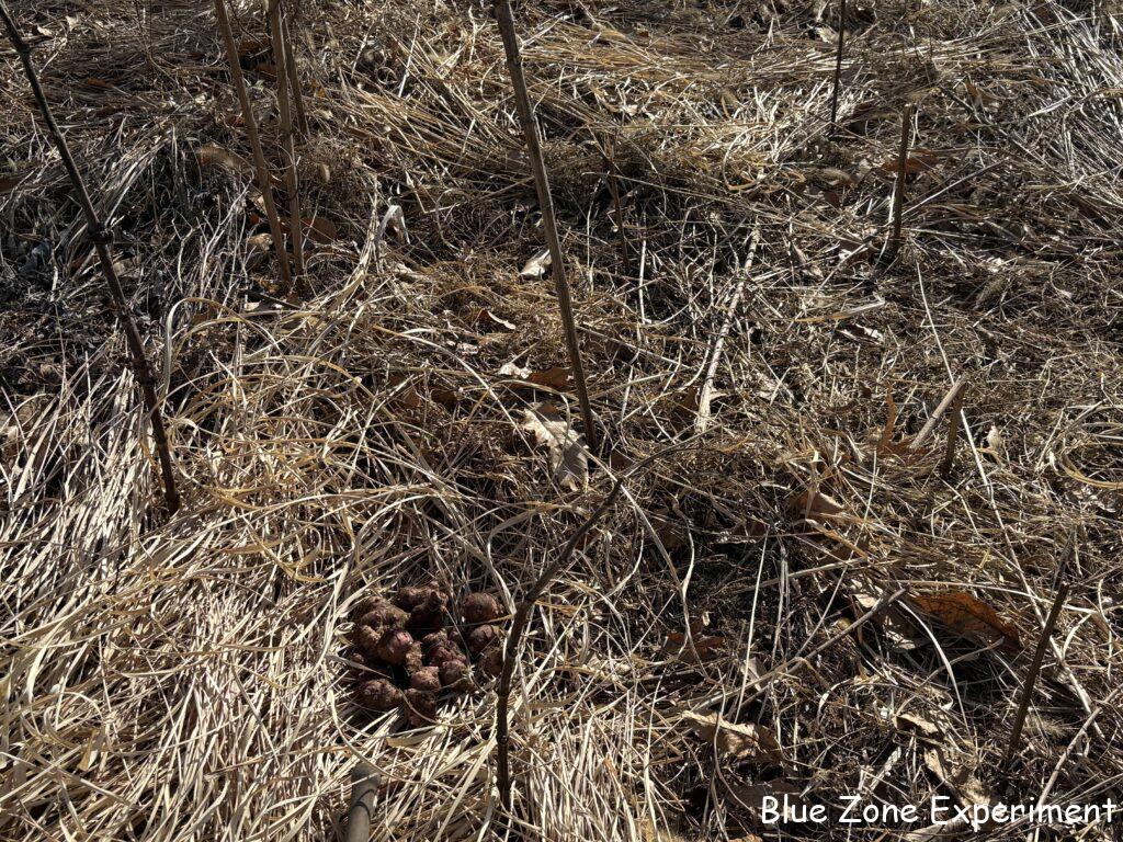 この時期までまだ畑に残っているのは、キクイモだけです。今日は、あと 4 株のうちの 2 株を掘りました。土が凍っていて、表面近くの芋にも氷がついていました。凍った土は固くてうまく掘れなかったので、掘り残しがあるかもしれません。種芋は白と赤があったにもかかわらず、これまで収穫した芋はすべて赤で、白いものはありません。寒いと赤くなるのでしょうか? 掘ったあとには、収穫した芋を種芋として埋めました。