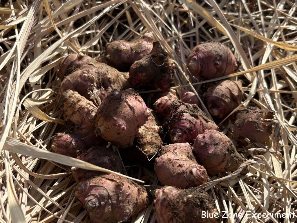 今日の収穫物はキクイモのみ。家に残っているのは、冷凍したり、乾燥させたりしたものを除くと、わずかな白菜と大根、ヤーコン、キクイモ、いただいたサトイモ少しだけとなりました。