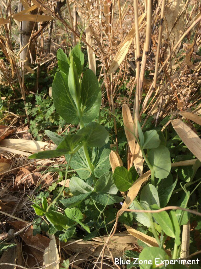 秋に種をまいたキヌサヤは順調で、立ててある笹につかまって上に伸び始めました。春に種をまいたスナップエンドウは、発芽があまりよくありません。下をモグラが通っているのかもしれません。