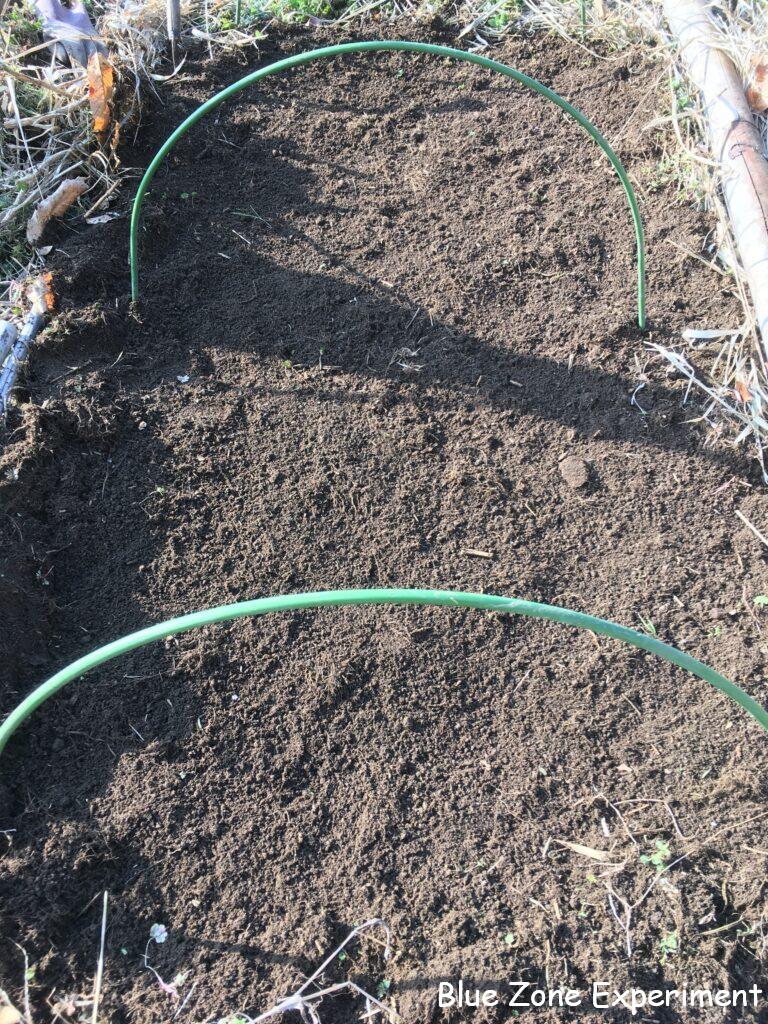 毎年、遅霜でせっかく育った苗がやられてしまうので、今年は不織布を二重掛けにすることにしました。冬野菜に使っていた不織布を再利用するつもりで、資材は持って行かなかったのですが、畑にあったものは寸足らず。一枚はぎりぎり何とかトンネルを作ることができたので、小さい方のもう一枚は、二重にしてべた掛けにしました。トンネルと二重べた掛けなので、合わせて三重です。発芽するまではこのままで、発芽したら、べた掛けは外し、大きい不織布を上から掛ける予定です。