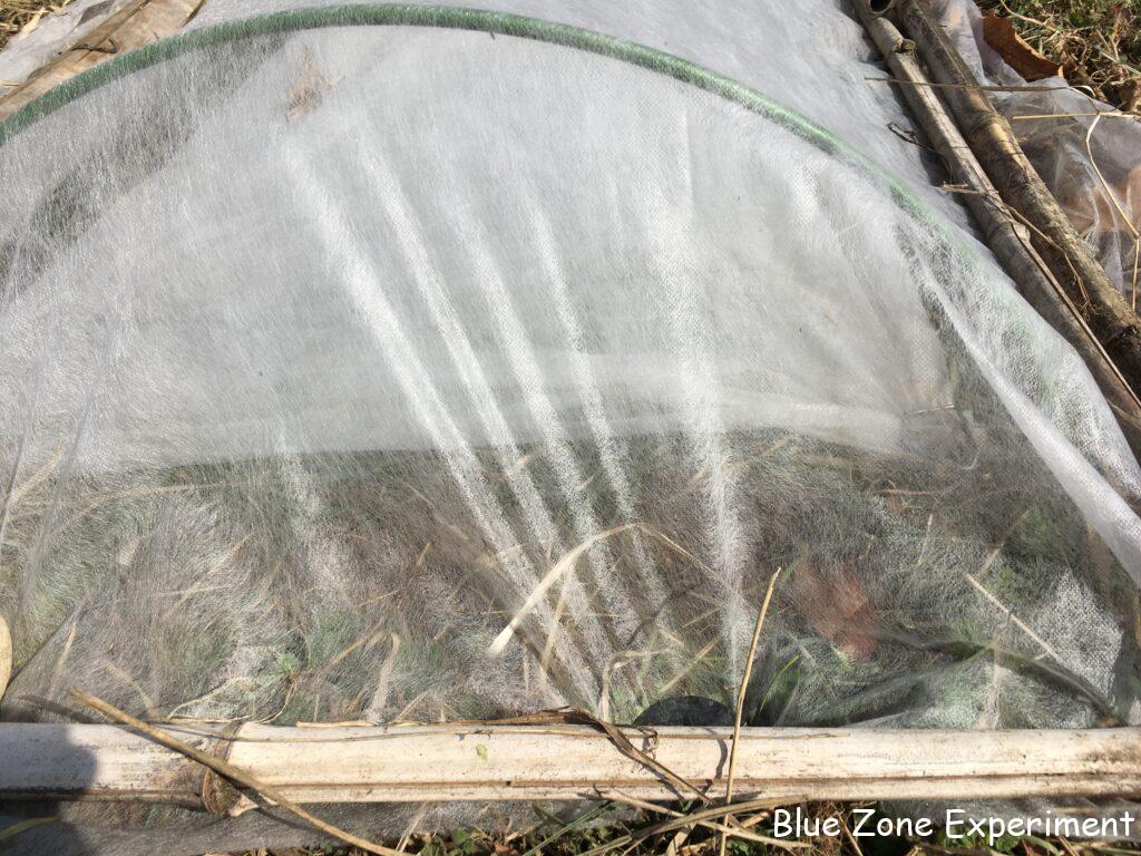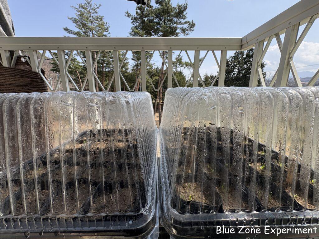 畑ですべて育苗できれば楽ですが、霜にやられる恐れがあるため、やはり家での育苗も必須です。また、家で作ったほうが早くできるので、収穫に至る時期も少し早まります。昼間は透明カバーをかけて外に出し、夜は室内に取り込んでいます。