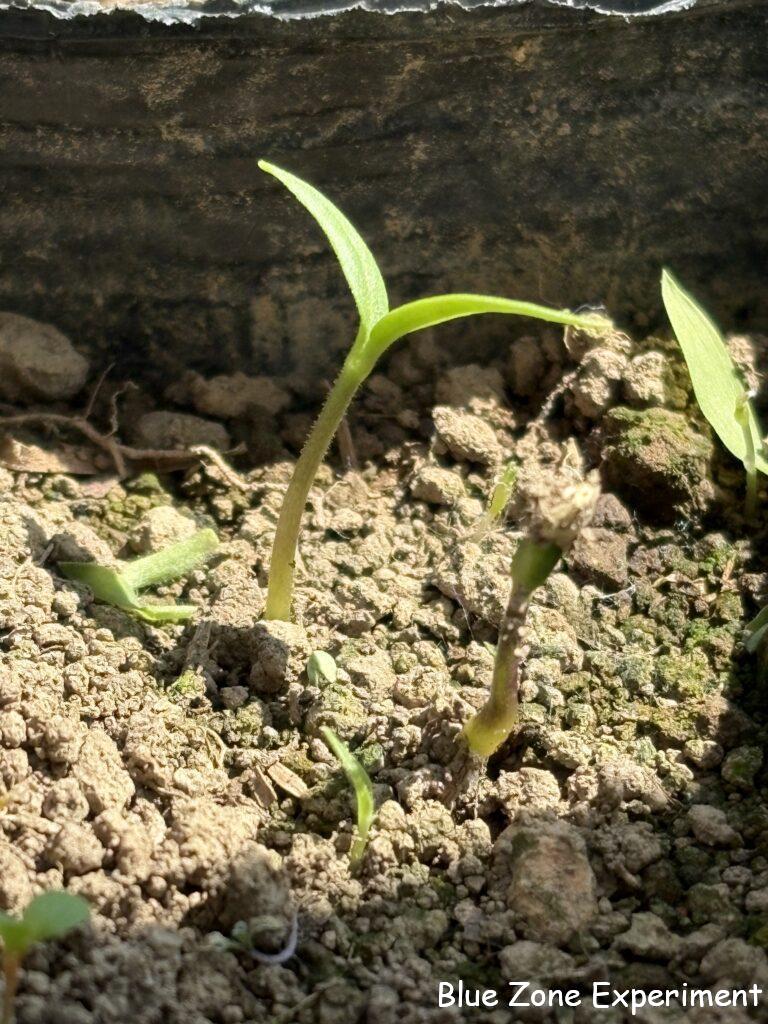 夏野菜は、家でも育苗しています。ナスとトウガラシ類は、3 月 14 日に種をまき、その一週間後にトマトの種をまきました。ナスは播種後 10 日、トウガラシ類は 12 日で発芽しはじめました。今日で 2 週間ですが、まだ発芽していないものもあります。トマトは 1 週間後の今日、一部の発芽を確認しました。