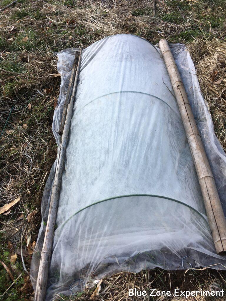 毎年、遅霜でせっかく育った苗がやられてしまうので、今年は不織布を二重掛けにすることにしました。冬野菜に使っていた不織布を再利用するつもりで、資材は持って行かなかったのですが、畑にあったものは寸足らず。一枚はぎりぎり何とかトンネルを作ることができたので、小さい方のもう一枚は、二重にしてべた掛けにしました。トンネルと二重べた掛けなので、合わせて三重です。発芽するまではこのままで、発芽したら、べた掛けは外し、大きい不織布を上から掛ける予定です。