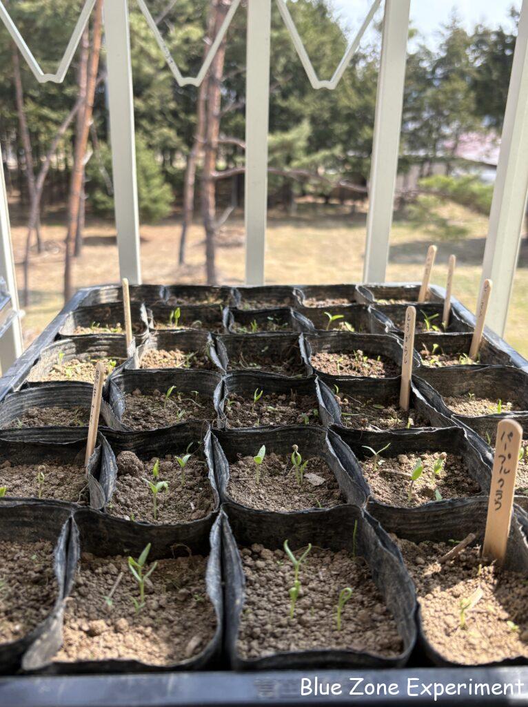 畑ですべて育苗できれば楽ですが、霜にやられる恐れがあるため、やはり家での育苗も必須です。また、家で作ったほうが早くできるので、収穫に至る時期も少し早まります。昼間は透明カバーをかけて外に出し、夜は室内に取り込んでいます。