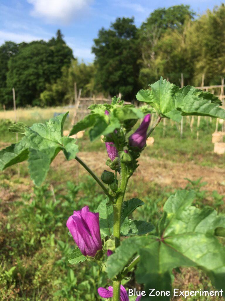 ブルーマロウは、コモンマロウやウスベニアオイとも呼ばれる、アオイ科ゼニアオイ属の植物です。花は、ドライにしてハーブティーにしたり、そのままエディブルフラワーとして料理に色を添えることもできます。また、若葉も食べることができます。次々に花をつけるので、畑に虫も呼んでくれて、とても便利な植物です。結構背が高くなり、大きく広がるので、植える場所を考えないと、日陰を作ってしまうのがちょっとした難点でしょうか。逆に、日陰を好む作物を近くに植えればメリットにもなりますね。