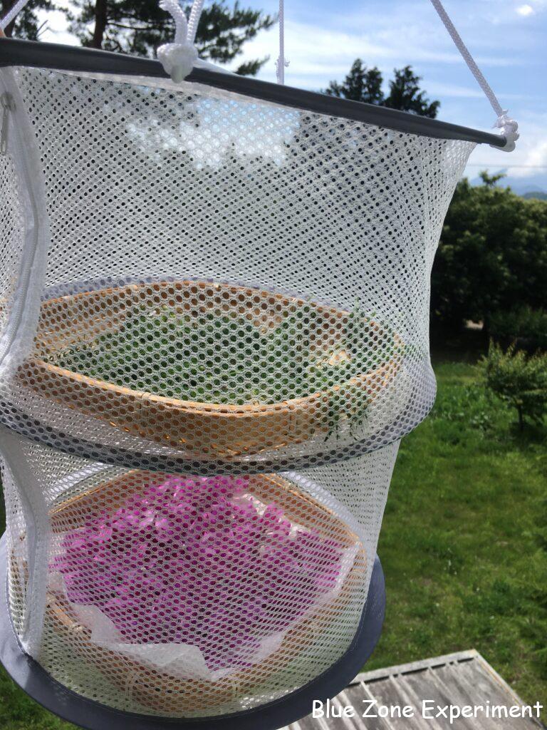 持ち帰った花を水洗いし、ガクを取ってから干しました。ガクの部分は、面倒ならとらなくても大丈夫だと思います。夜は湿気るので家の中に取り入れて、晴れた日に三日ほど乾燥させました。