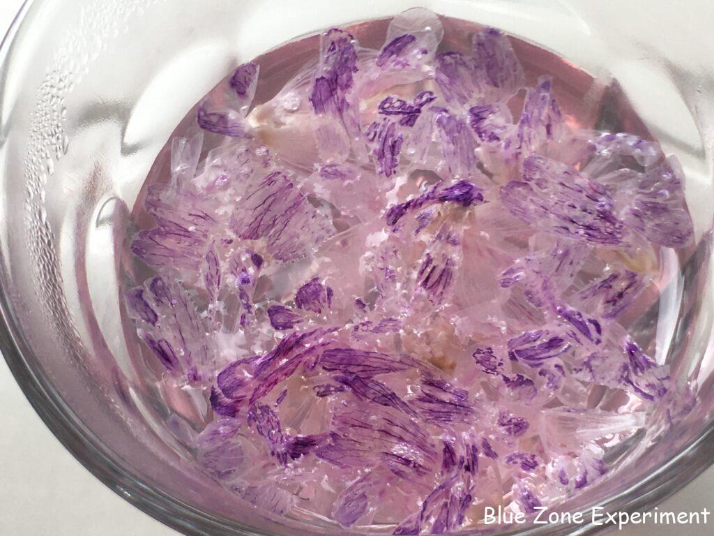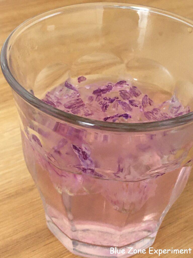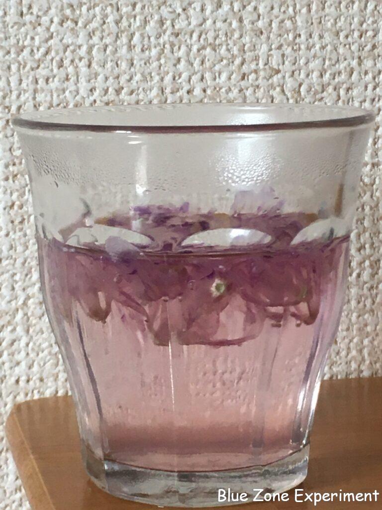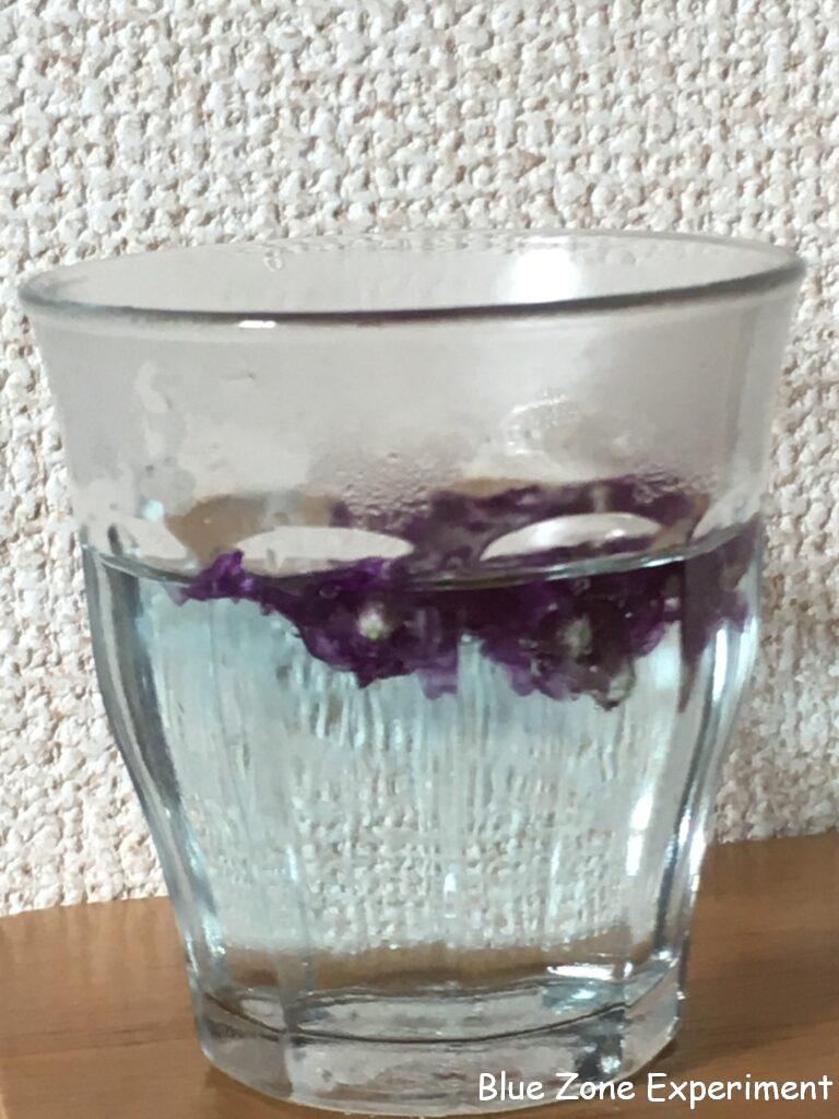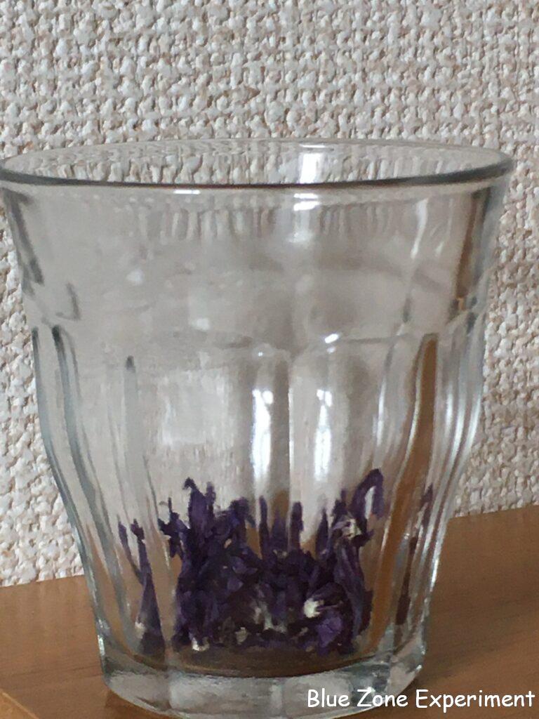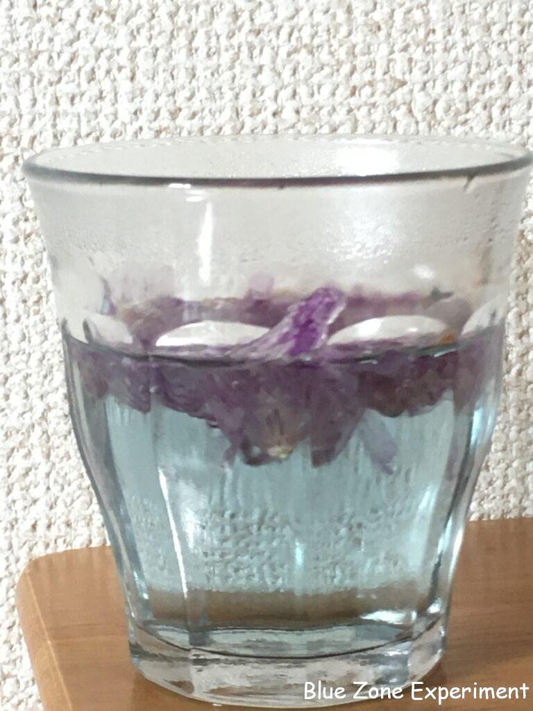 レモン汁の実験は成功しましたが、やはり青いお茶が見てみたいです。もしかすると時間が経ちすぎたのが原因かもしれないと思い、今度は、色の変化が分かるように、グラスに直接花をいれてみることにしました。