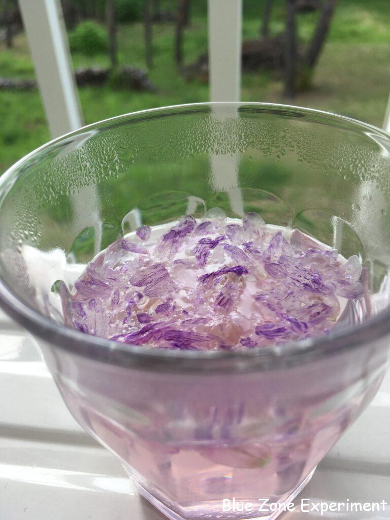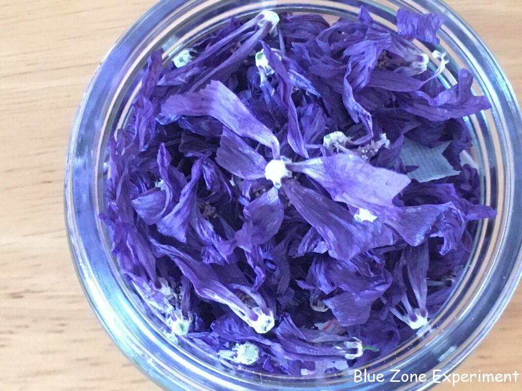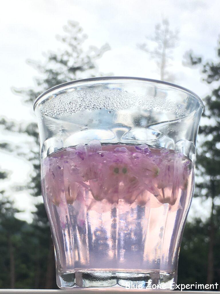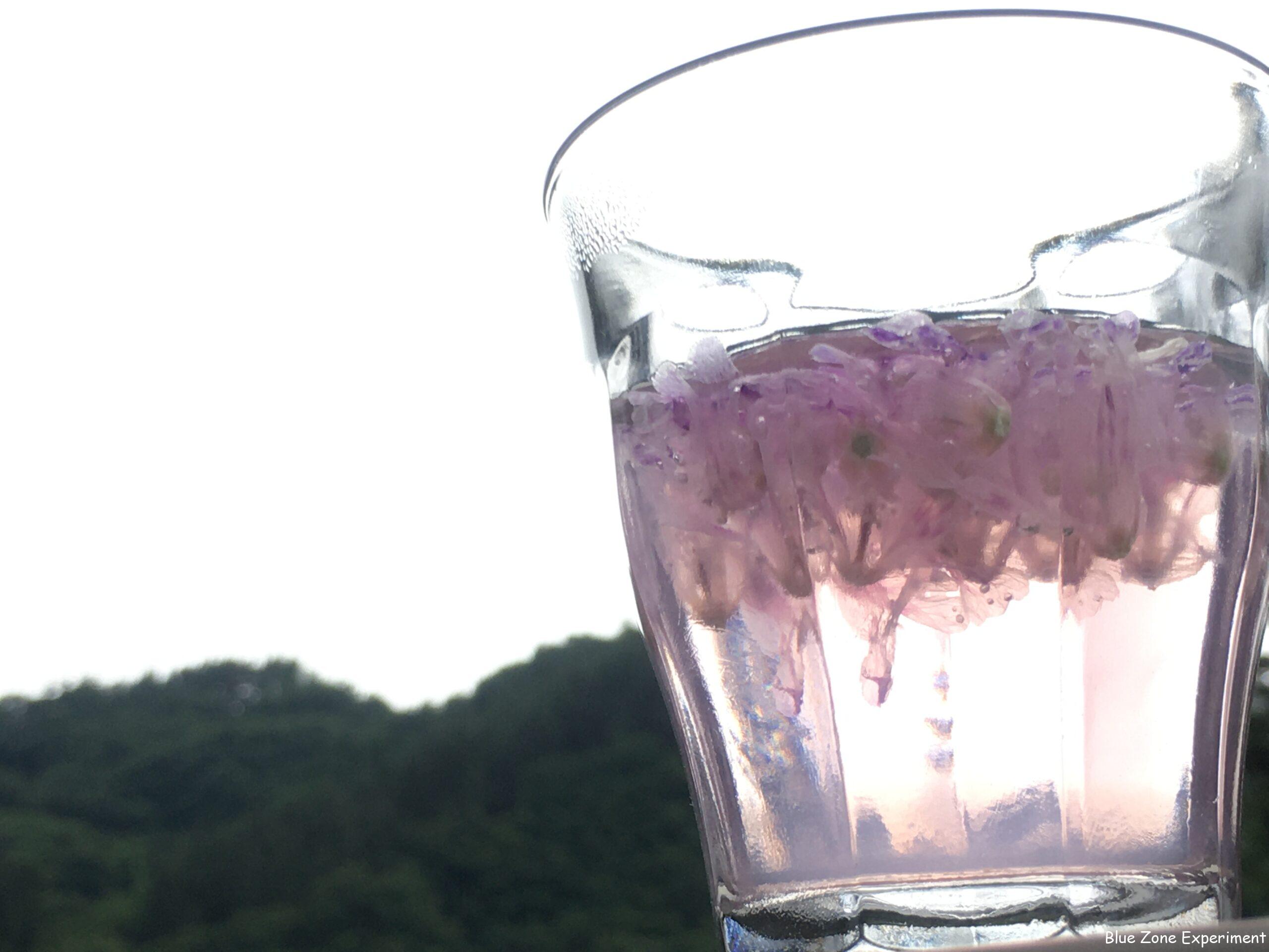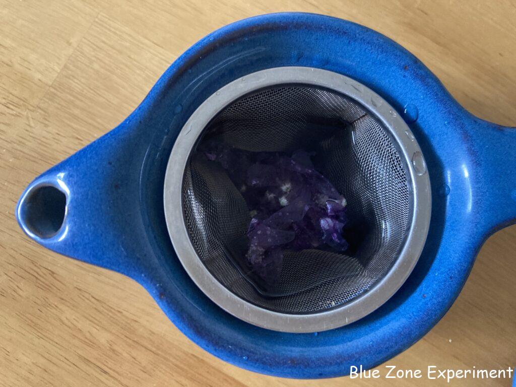 レモン汁の実験は成功しましたが、やはり青いお茶が見てみたいです。もしかすると時間が経ちすぎたのが原因かもしれないと思い、今度は、色の変化が分かるように、グラスに直接花をいれてみることにしました。