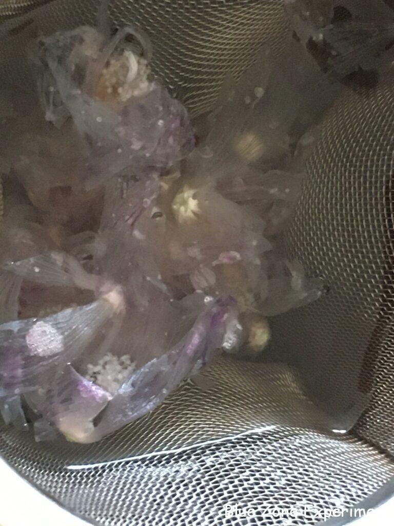 今度は成功です! 花の上にお湯を注ぐと、お湯がみるみる青く変色します。花の色が抜けるとお湯がきれいなブルーに。この色はアントシアニンの色素だそうです。そこにレモン汁を注ぐとピンクに変色しました。