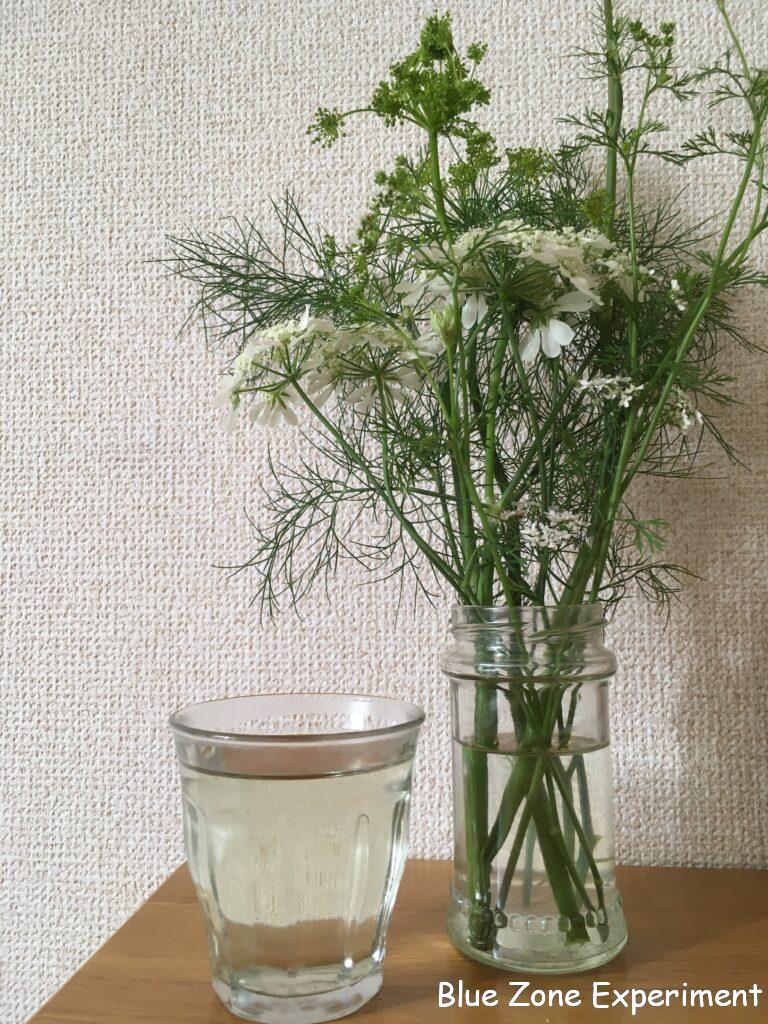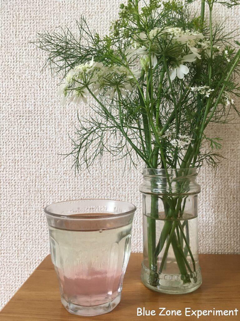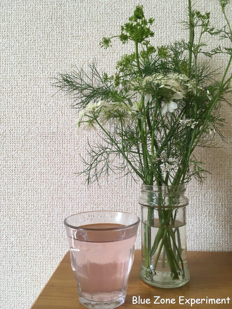 このお茶は、レモン(酸)を加えると、ピンクに変色するということなので、それも試してみました。黄色いお茶にレモン汁を加えると、レモン汁が沈んだ下の方だけピンクに変わったので、混ぜてみると全体がきれいなピンク色に。ちなみにグラスの横に飾ってあるのは、畑から摘んできたオルレアとディルの花です。