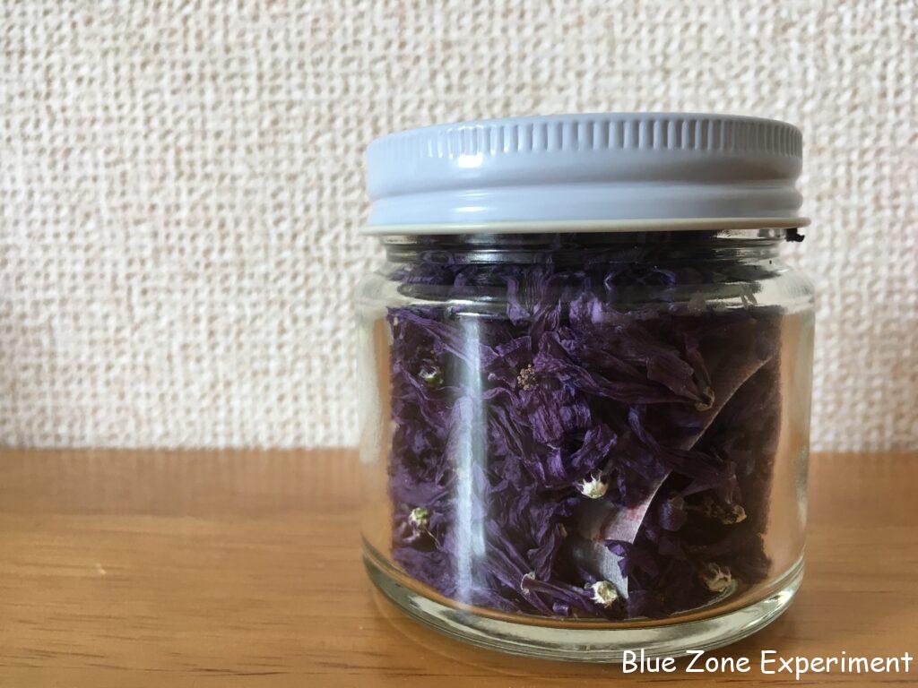 乾燥した花は、乾燥剤と共に瓶に入れました。一回目は 100 個の花を収穫しましたが、同じく 100 個をあと二回、合計 300 個の花を収穫しました。100 個の花を摘んだ二日後には、すでに元通りにたくさんの花が咲いていたくらい、よく花を咲かせてくれます。